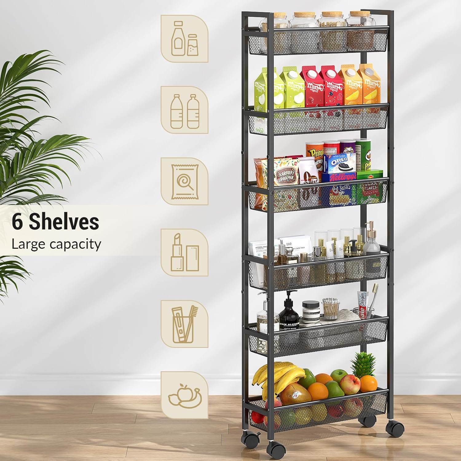 【6-Tier Storage】This slim storage rack is perfect for various places such as kitchen, bathroom, laundry room, living room and so on. You can use it to place spice bottles, toiletries, bath towels, books and other miscellaneous items to keep the room neat and organized, ensuring maximum storage efficiency in a small space.