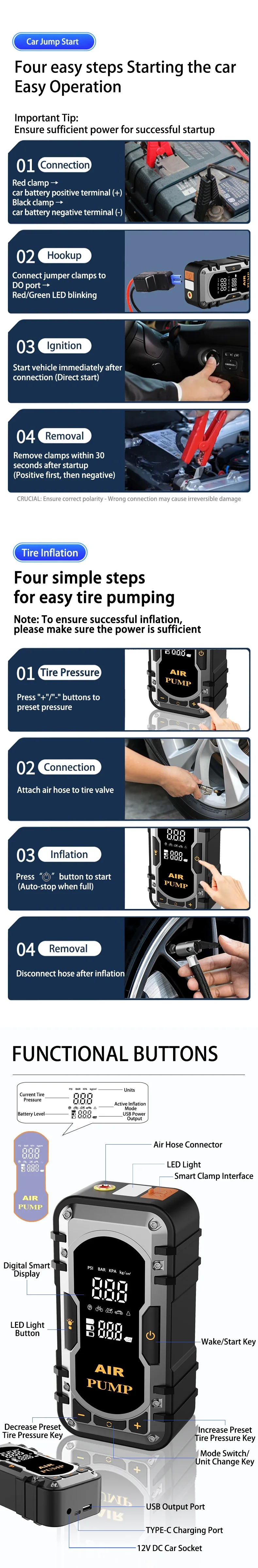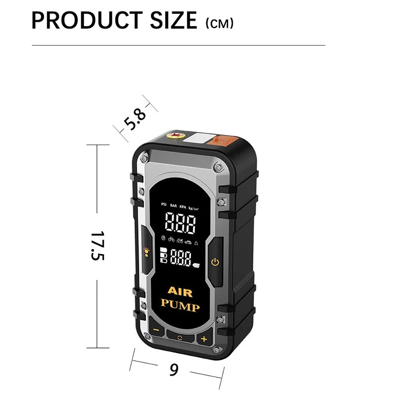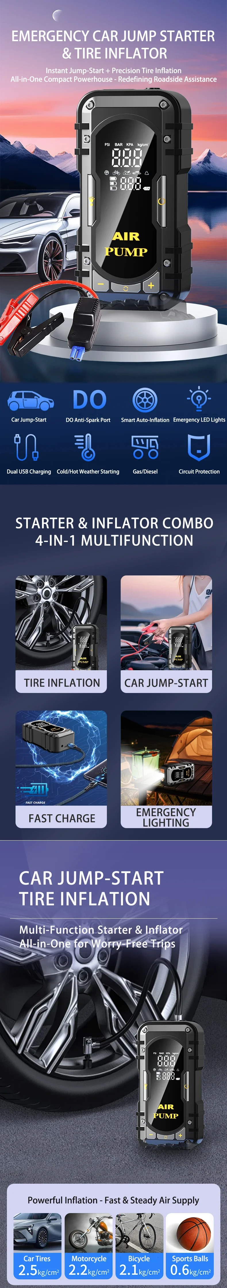 car starter but also inflate the tire in emergency situations. built-in digital inflator provides a maximum pressure of 150 PSI, can be set to 4 inflation modes: car tire, motorcycle, bike, ball and with 4 types of unit switching, BAR, KPA, PSI, Kg/cm². Automatically stops when tire inflation reaches preset pressure, safe and convenient.
