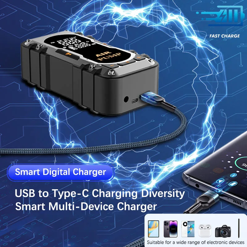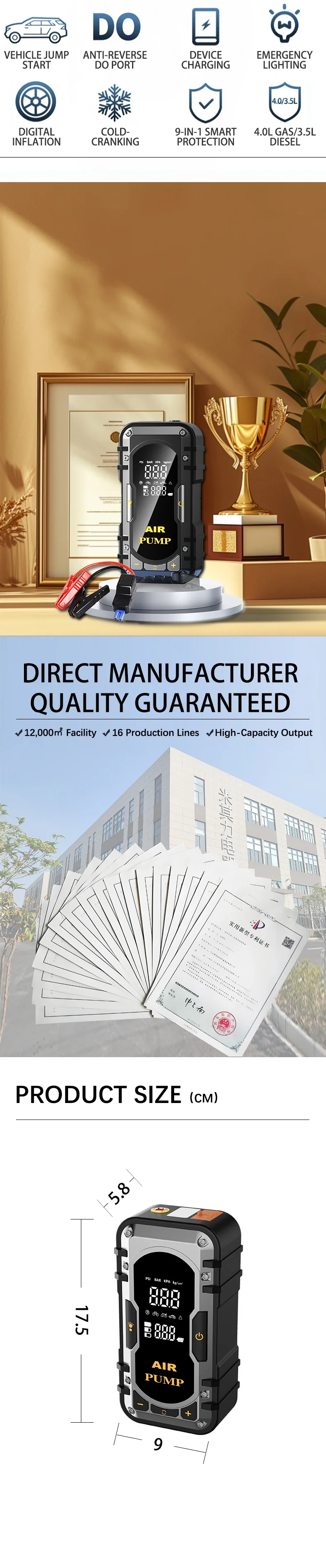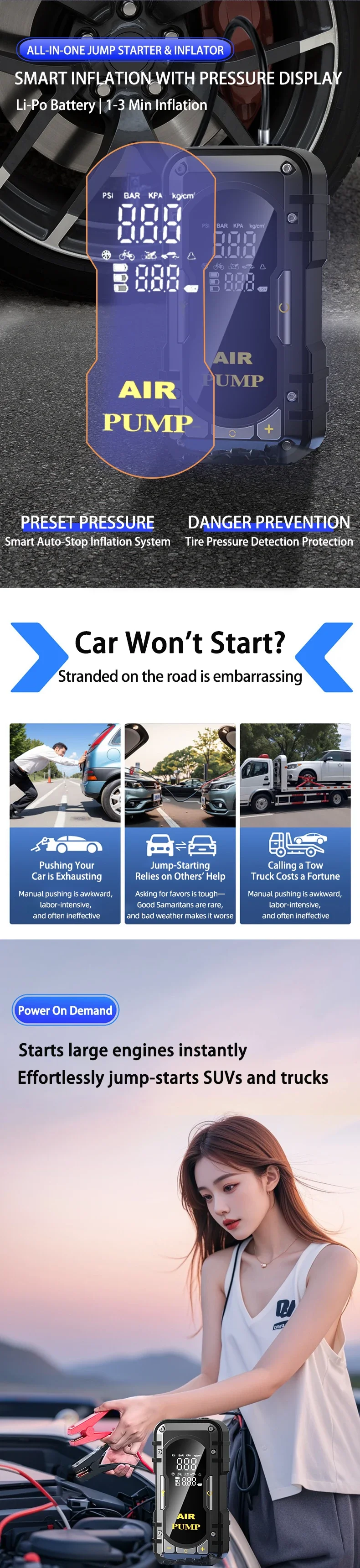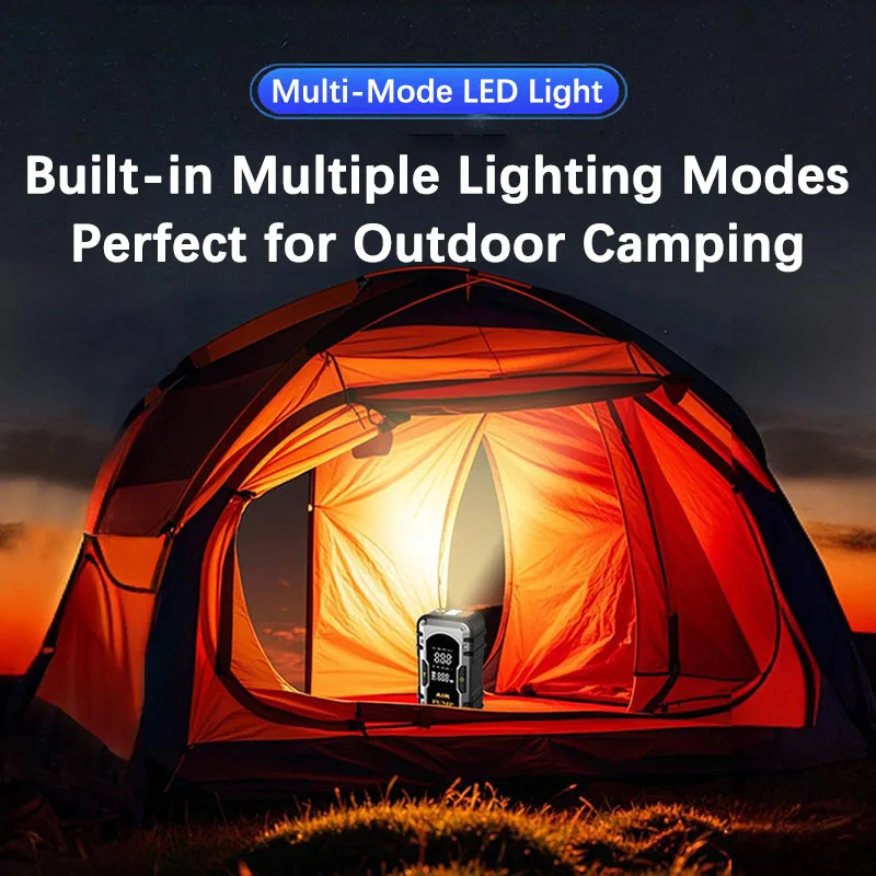 car starter but also inflate the tire in emergency situations. built-in digital inflator provides a maximum pressure of 150 PSI, can be set to 4 inflation modes: car tire, motorcycle, bike, ball and with 4 types of unit switching, BAR, KPA, PSI, Kg/cm². Automatically stops when tire inflation reaches preset pressure, safe and convenient.