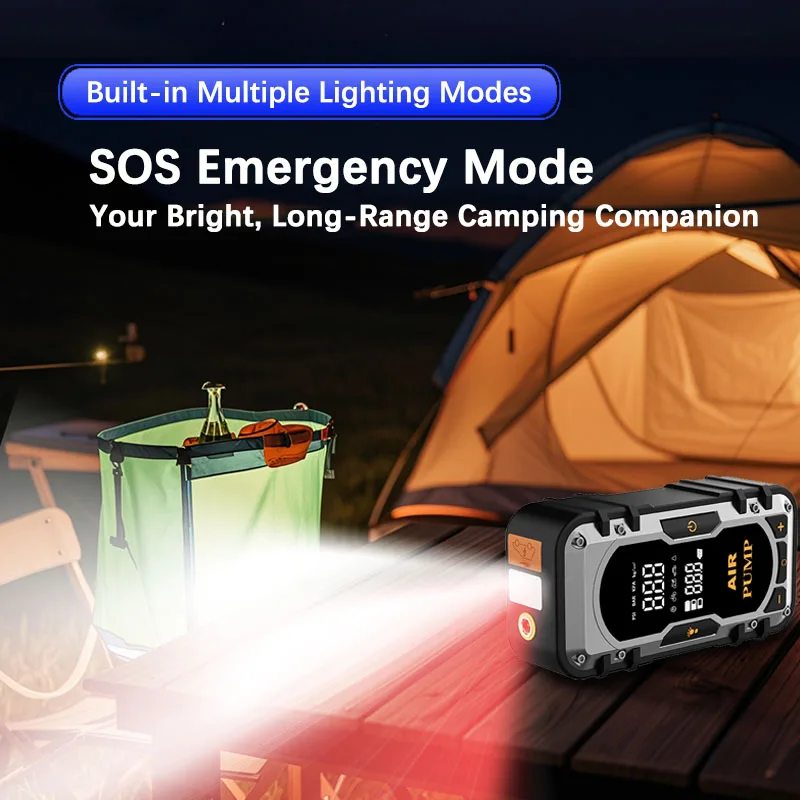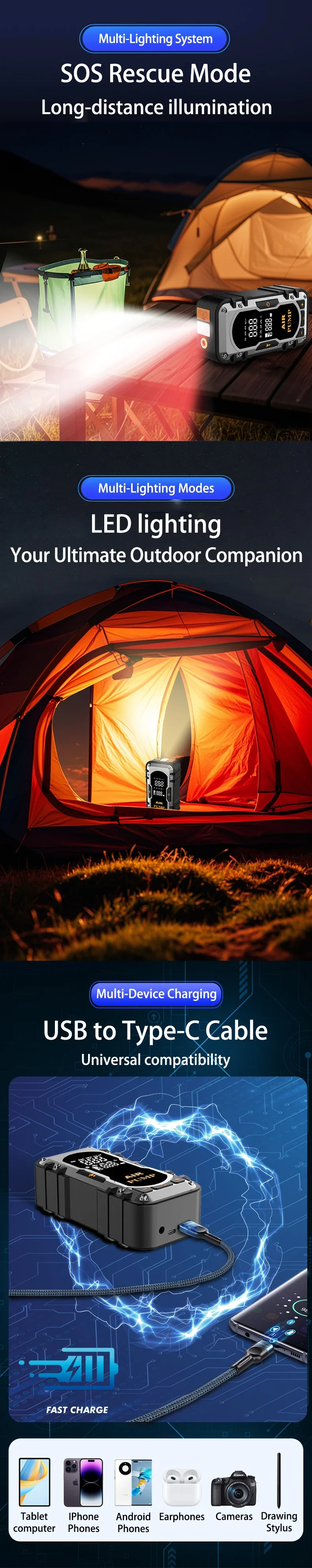 jump starter has a screen. Portable jump starter is able to detect and display the operating status, battery level and possible errors in real time, letting you know everything at a glance about the car jumper battery pack.car battery starter There are 4 lighting modes with built-in LED light (Lighting/Attention/SOS/Strobe), very suitable for camping, outdoor, indoor, emergency, travel, etc.
