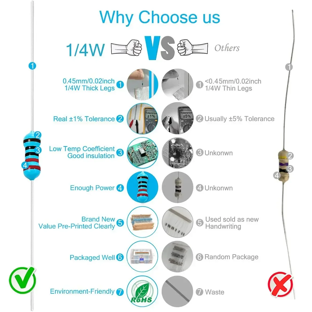 Upgraded 1/4w ±1% Metal film resistor with RoHS certification ; 2 Pins’ Length: 0.96 inch / 24.5 mm. Able to cut resistor’s pins freely for breadboard in electronic projects