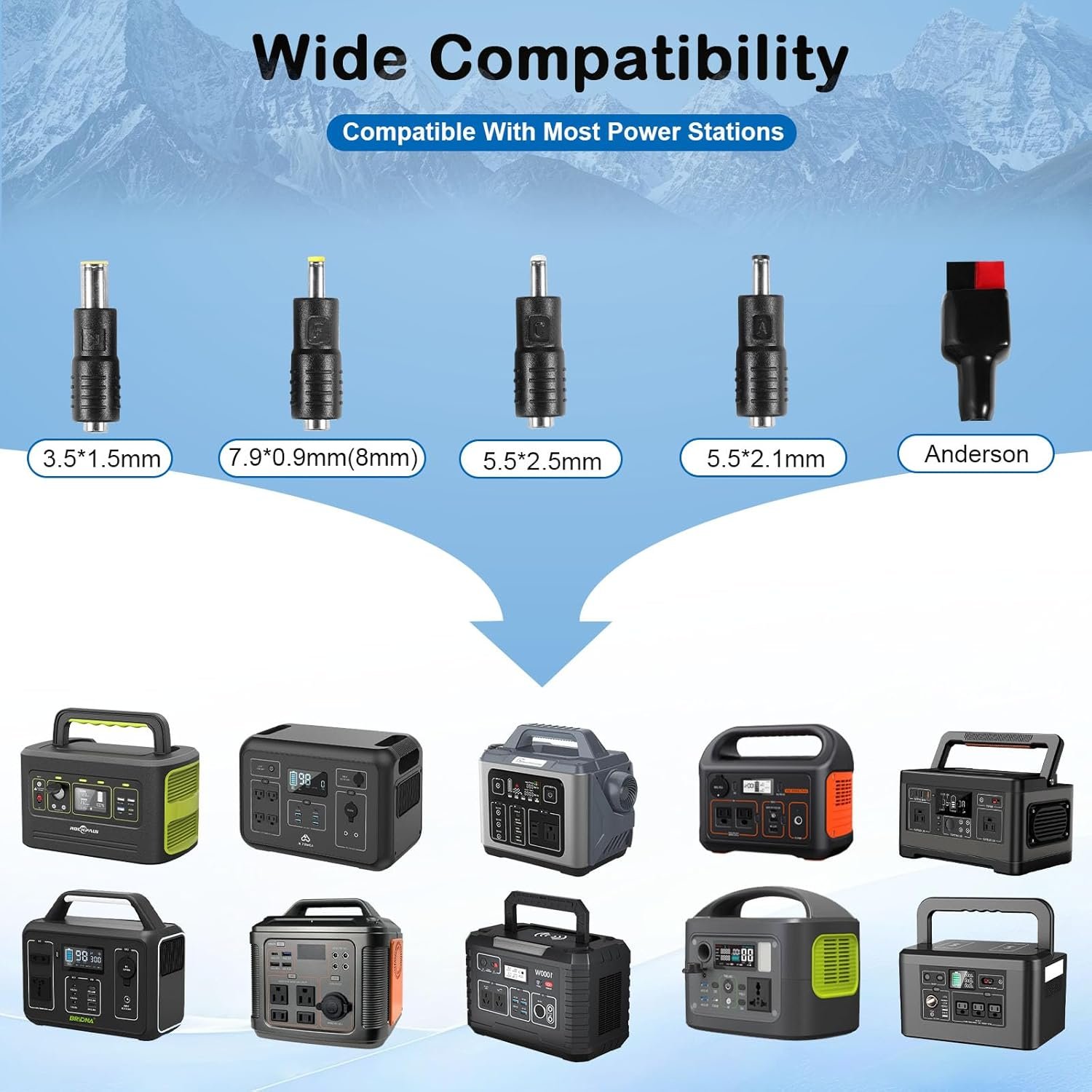 【WIDE COMPATIBILITY 】Our 60W Solar Panels Battery Charger Kit Could Charge Our USB Devices With USB-1 And USB-2 Cables, Such As Smart phones,Laptops, Cameras, Small Fans, Ect .With The 8-In-1 DC Connector, It Could Compatible With Most Solar Generators.