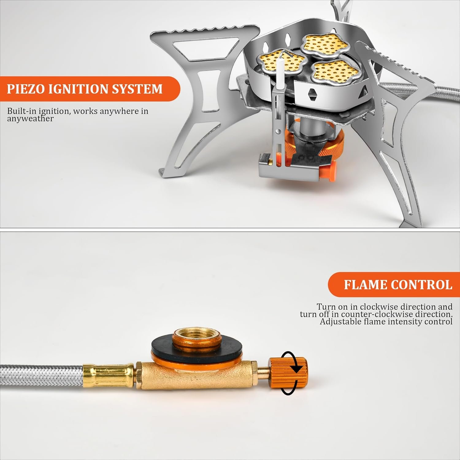 【Easy Ignition & Precise Flame Control】 Equipped with a built-in piezoelectric ignition system, starting the stove is effortless. The adjustable flame controller allows you to customize heat levels, while the windproof shield ensures consistent performance in challenging outdoor environments.