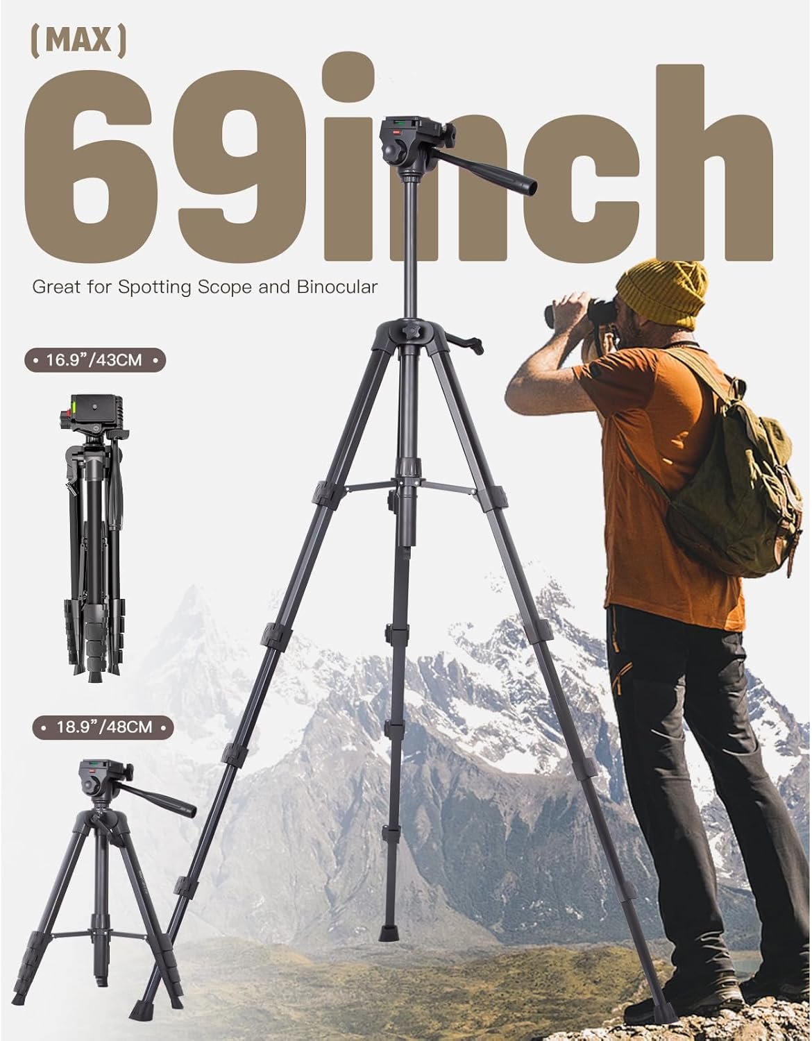 【Tripod Height】: Made of aluminum, this tripod adjusts from 16.9 to 69 inches (up to 73 inches with a birding scope). It features a 10cm rotatable phone holder and a detachable head that compresses to 16.9 inches for easy storage—perfect for lightweight birdwatching.
