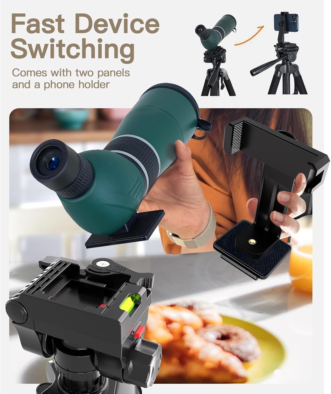 【Package Content & Notice】: In the package, you will get: 1 x spotting scope tripod, 1 x binocular adapter, 2 x quick release plate, 1 x phone holder, 1 x carry bag. Notice: Please ensure that your binoculars have a standard 1/4″ threaded hole before purchasing, as the adapter is only compatible with that configuration.