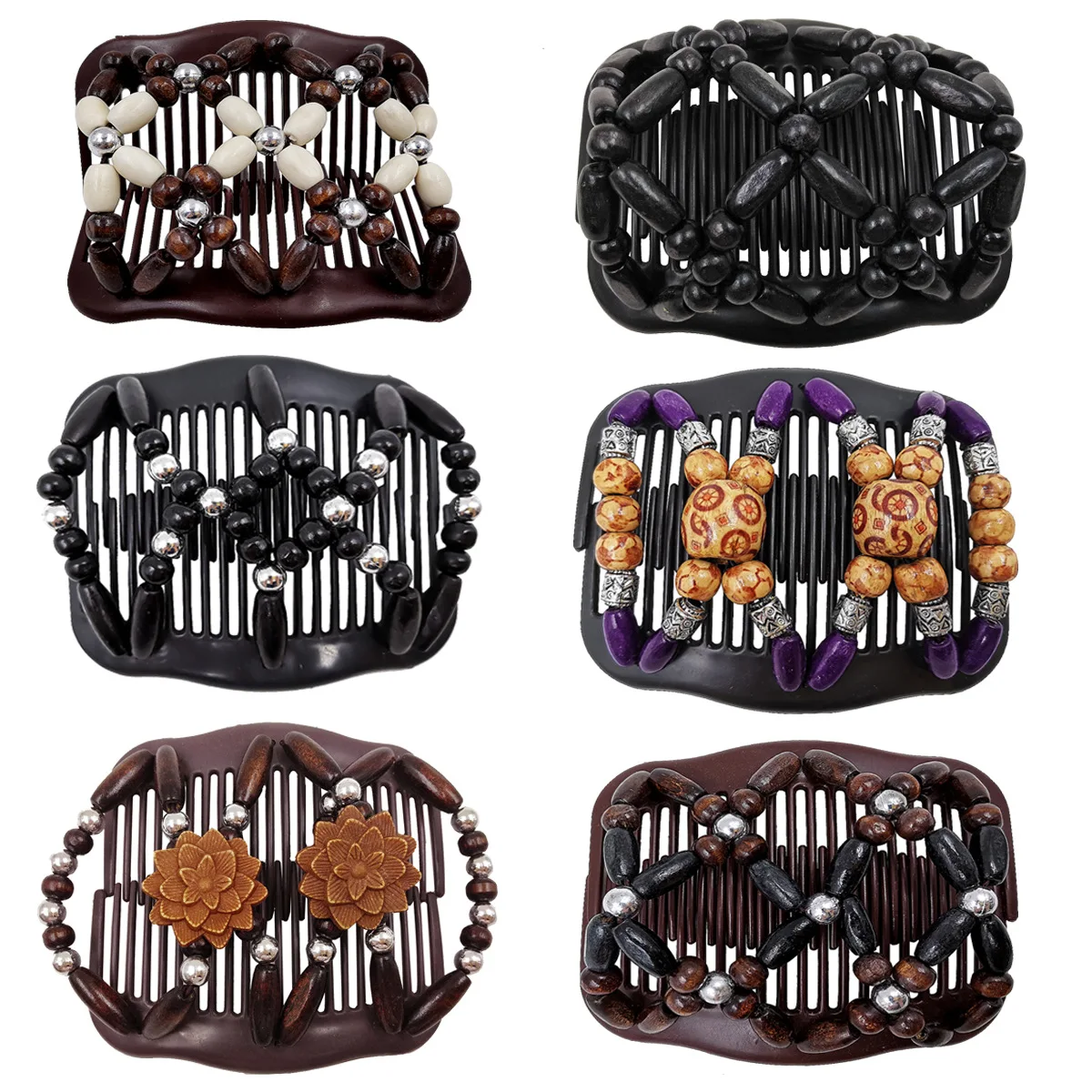 6Pcs Women Hair Combs Accessories Magic Stretch Wooden Beads Double Side Combs Butterfly Wood Beaded Hair Combs Magic Elastic