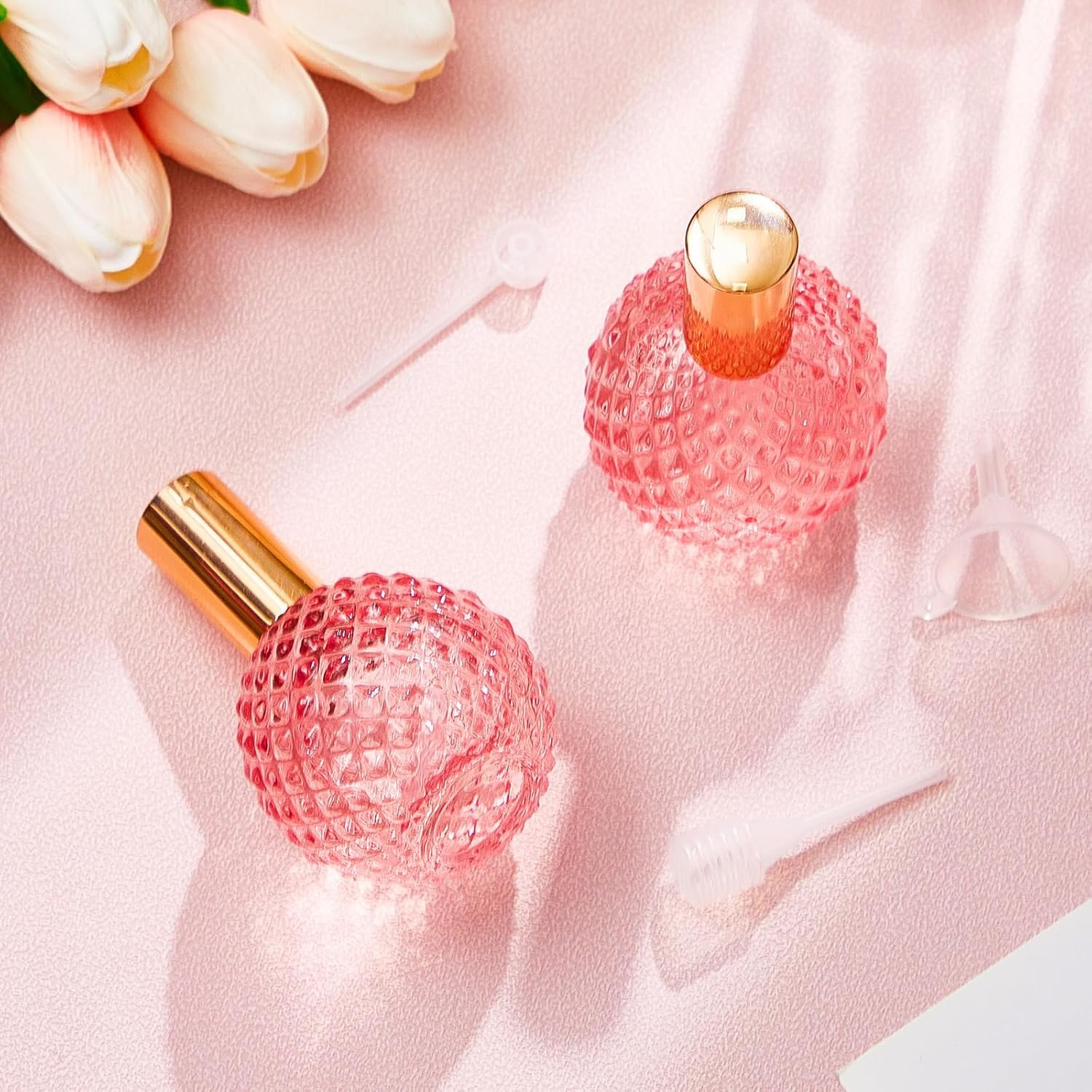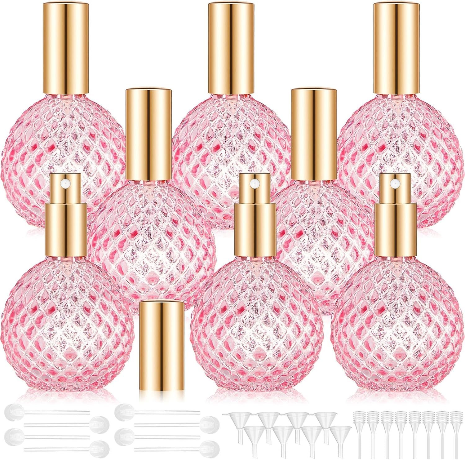 Retro Perfume Bottle Set: our retro perfume bottle set contains 8 pink glass perfume bottles, each 100ML, measuring 4.1x 2.6 inches (10.5x 6.6cm); The pink round bottle body and diamond cut pattern design are elegant and chic, ideal for home decoration and a thoughtful gift for friends and family