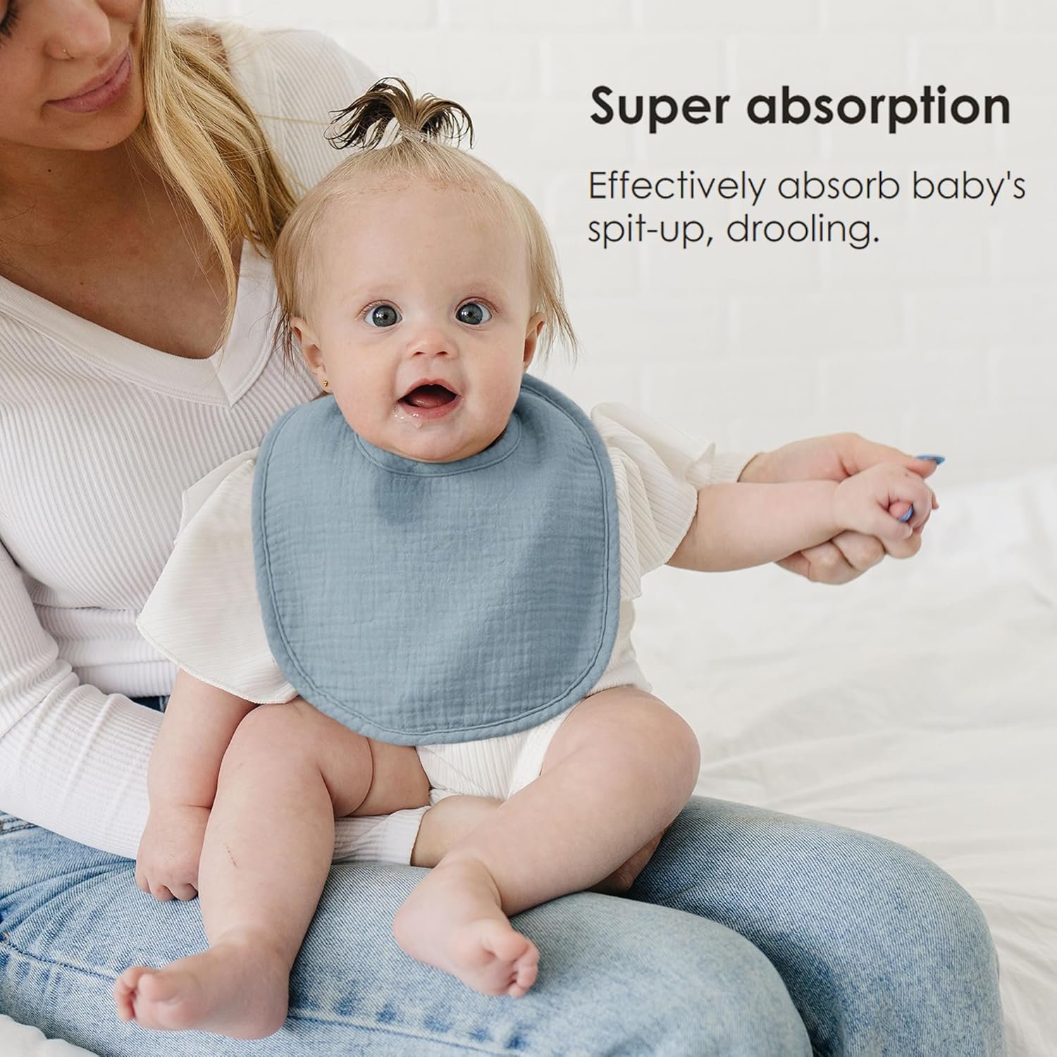 DUAL-LAYER DESIGN FOR MAXIMUM ABSORBENCY: Crafted with a soft 100% cotton front and an absorbent polyester fleece back, these muslin bibs keep your baby dry throughout the day, whether during teething, feeding, or drooling moments