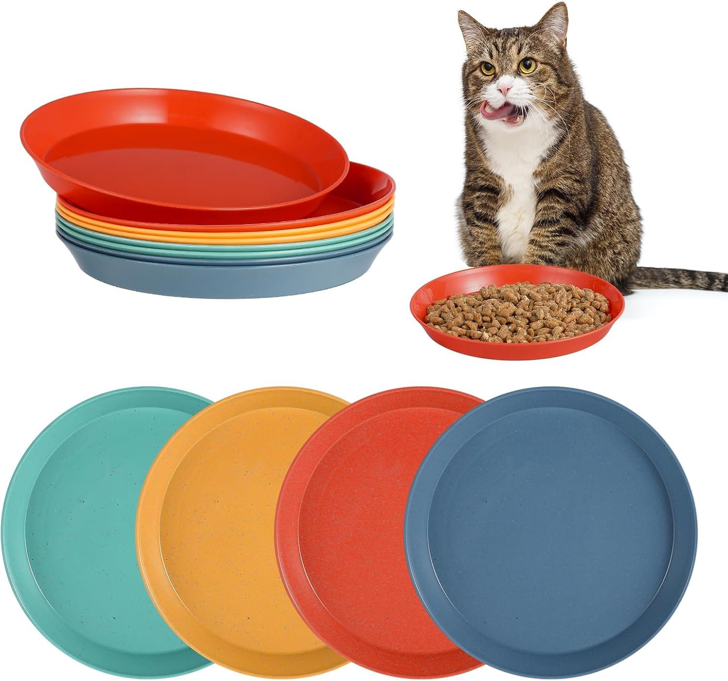 【Package Includes】You will receive 8 pieces of shallow cat food dishes with a size of 5.9 inches,in 4 different colors (blue, green,yellow,orange),2 pieces of each color,enough quantity to satisfy multiple pets Feeding needs.