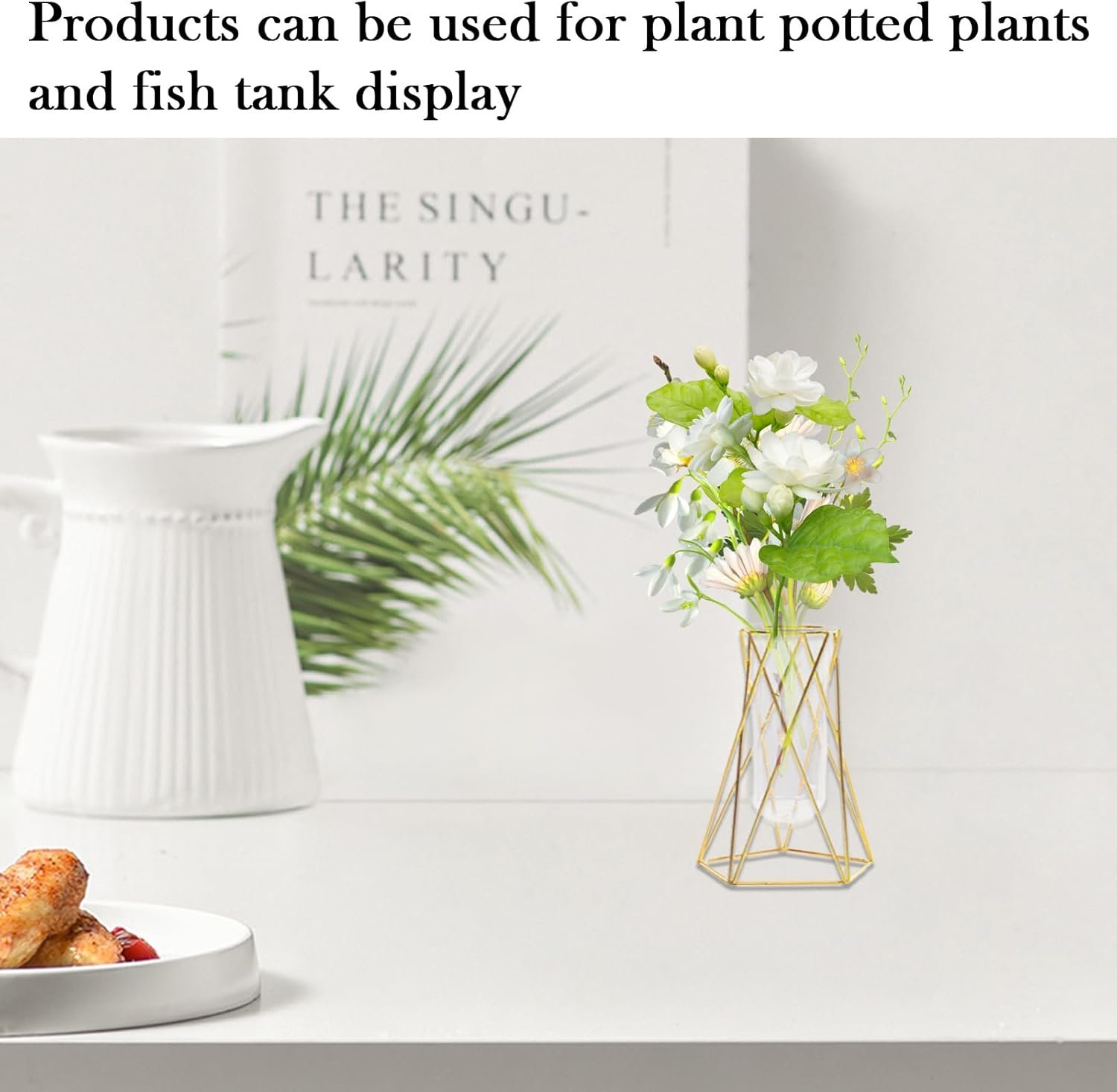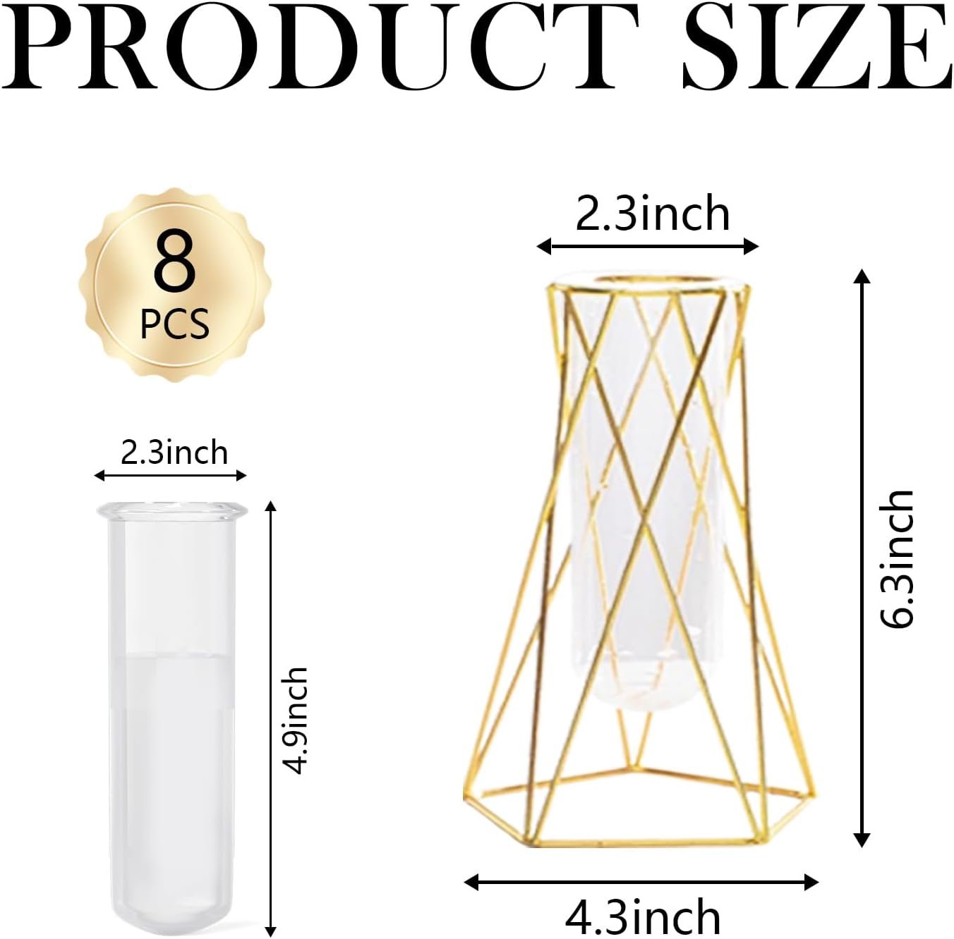 【Vases for Decor】You will receive 8 sets gold flower vase,including 8 transparent glass test tubes (4.9*2.3 inch/12.5*5.8cm) + 8PCS metal geometric vase (caliber 2.3*bottom diameter 4.4*height 6.3 inches/5.8*11*16cm),suit your decorating needs, not include flower. These vases are perfect for showcasing your favorite flowers, houseplants, or creative arrangements.