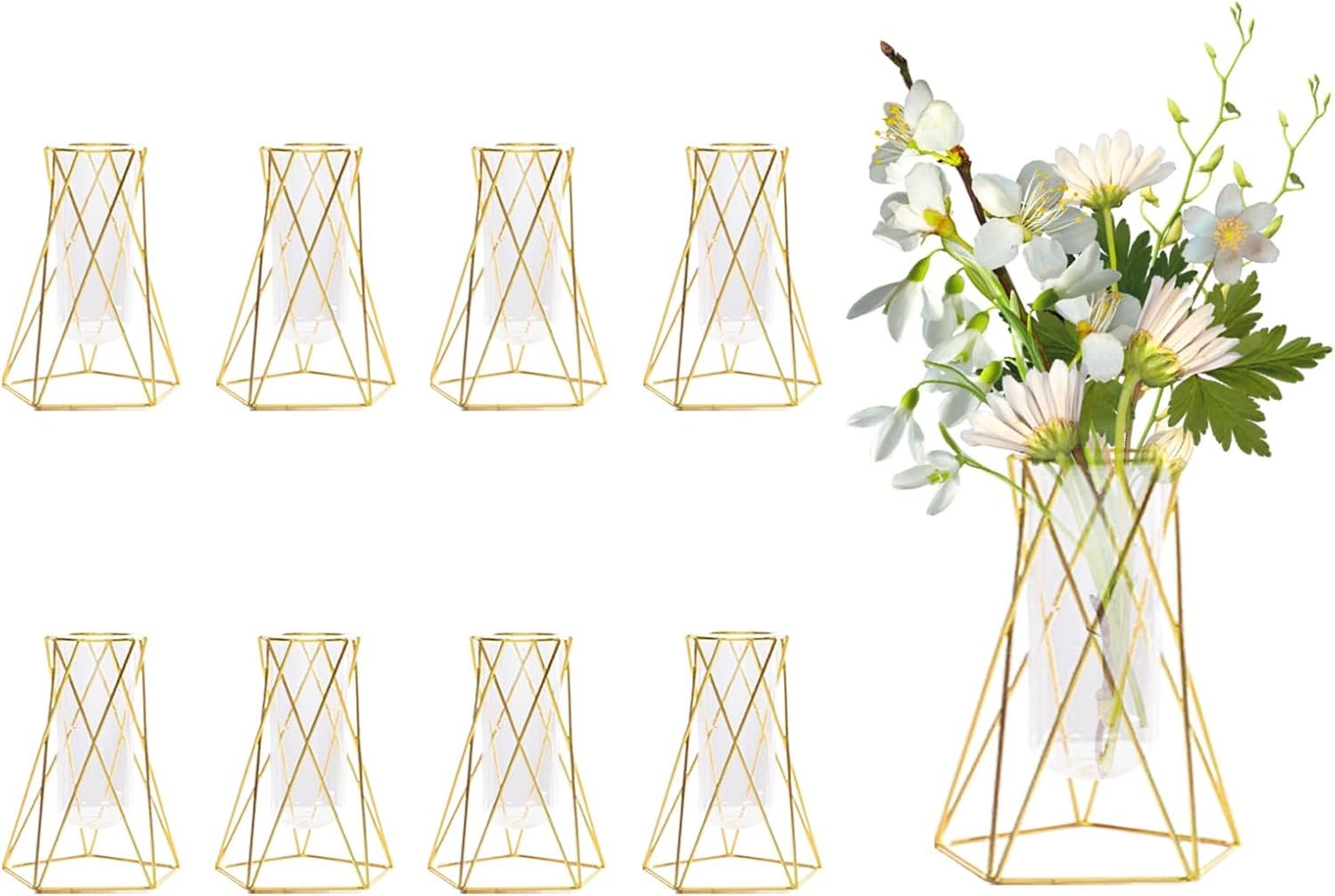 8 Pcs Gold Geometric Vases for Centerpieces, 6.3 Inch Metal Flower Stand with Glass Vase Hydroponic Plant Test Tube Vases Modern Vase for Wedding Home Decor