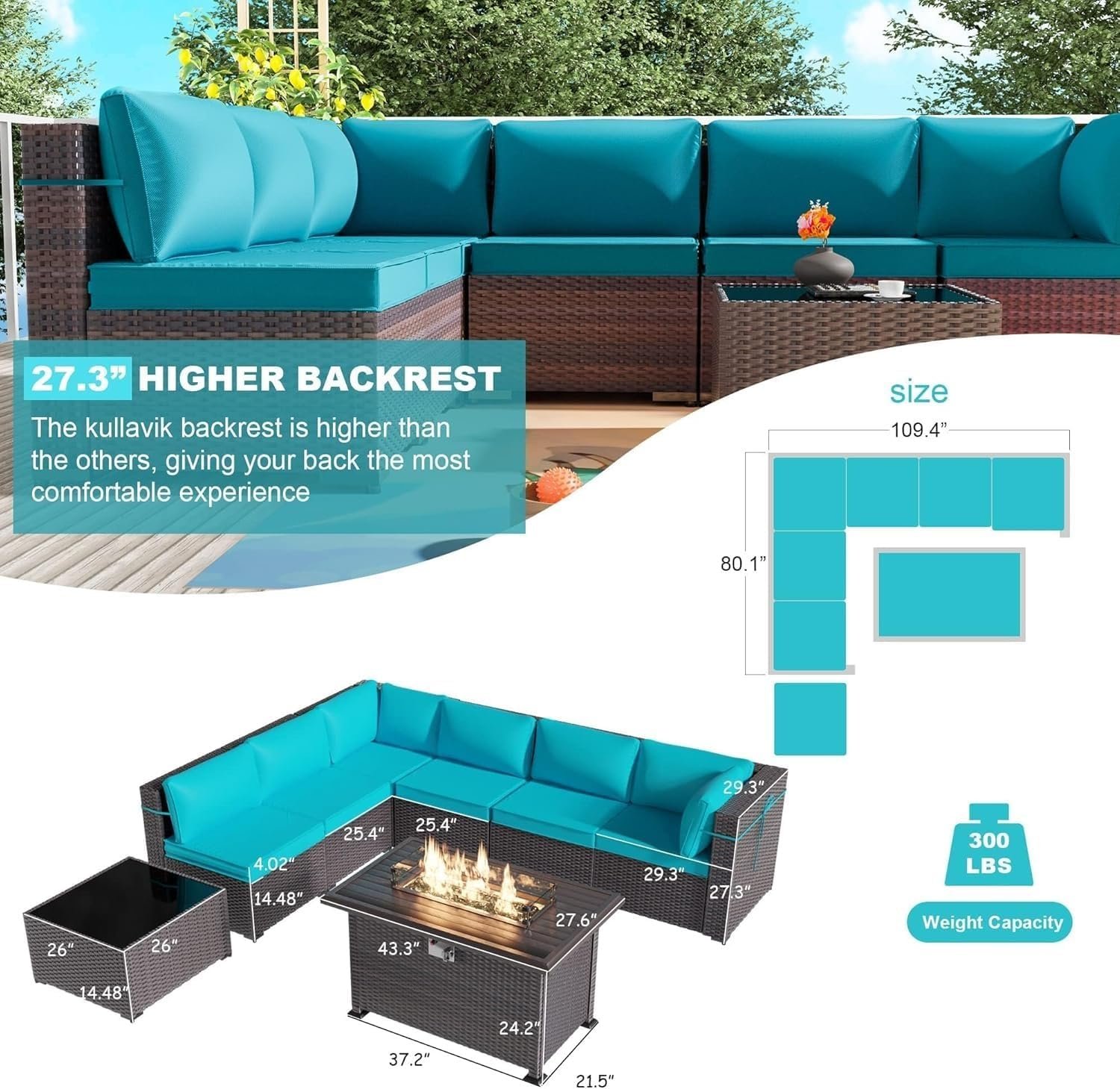 Spacious 8 Piece Outdoor Seating Arrangement:This outdoor patio furniture set includes a modular rattan sectional sofa and a 43 inch gas propane fire pit table, offering generous seating space for relaxing and entertaining in backyard, garden, deck, or porch areas.