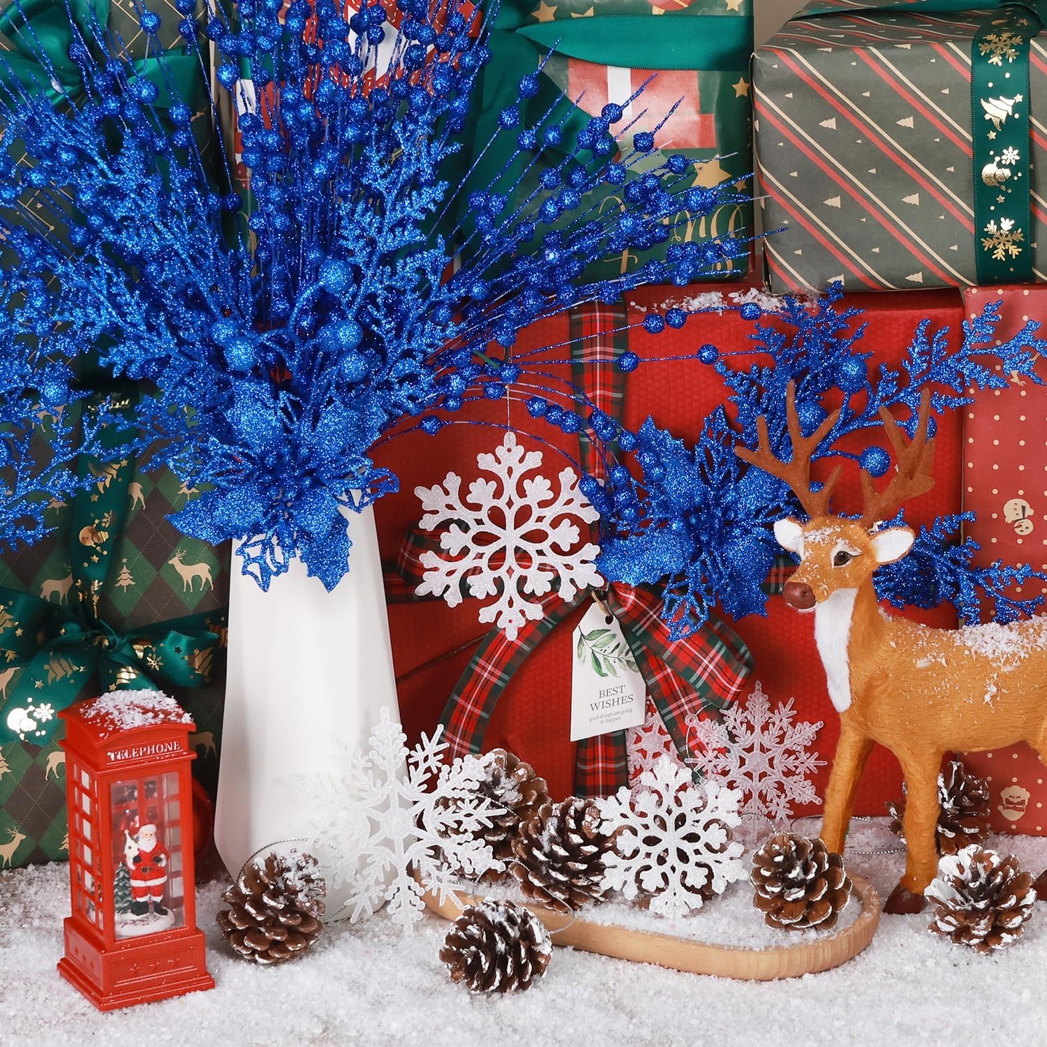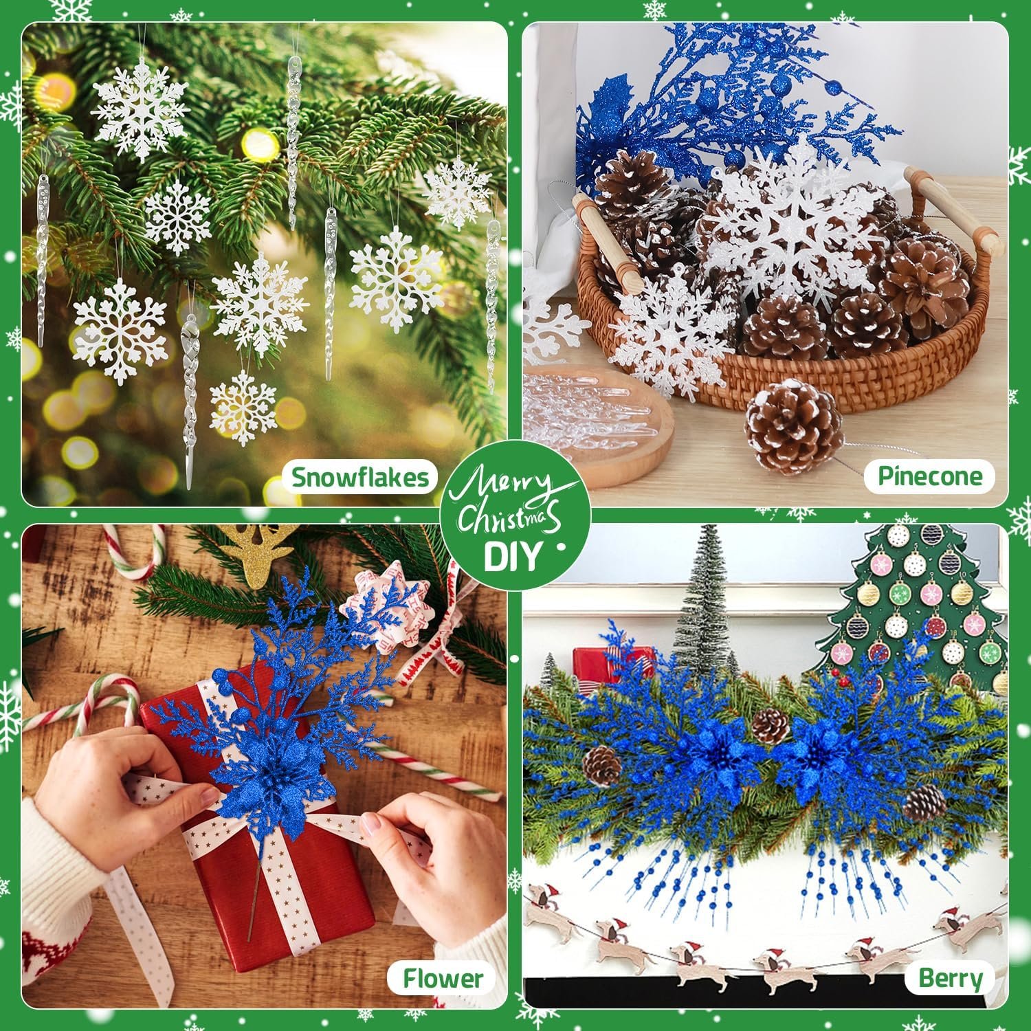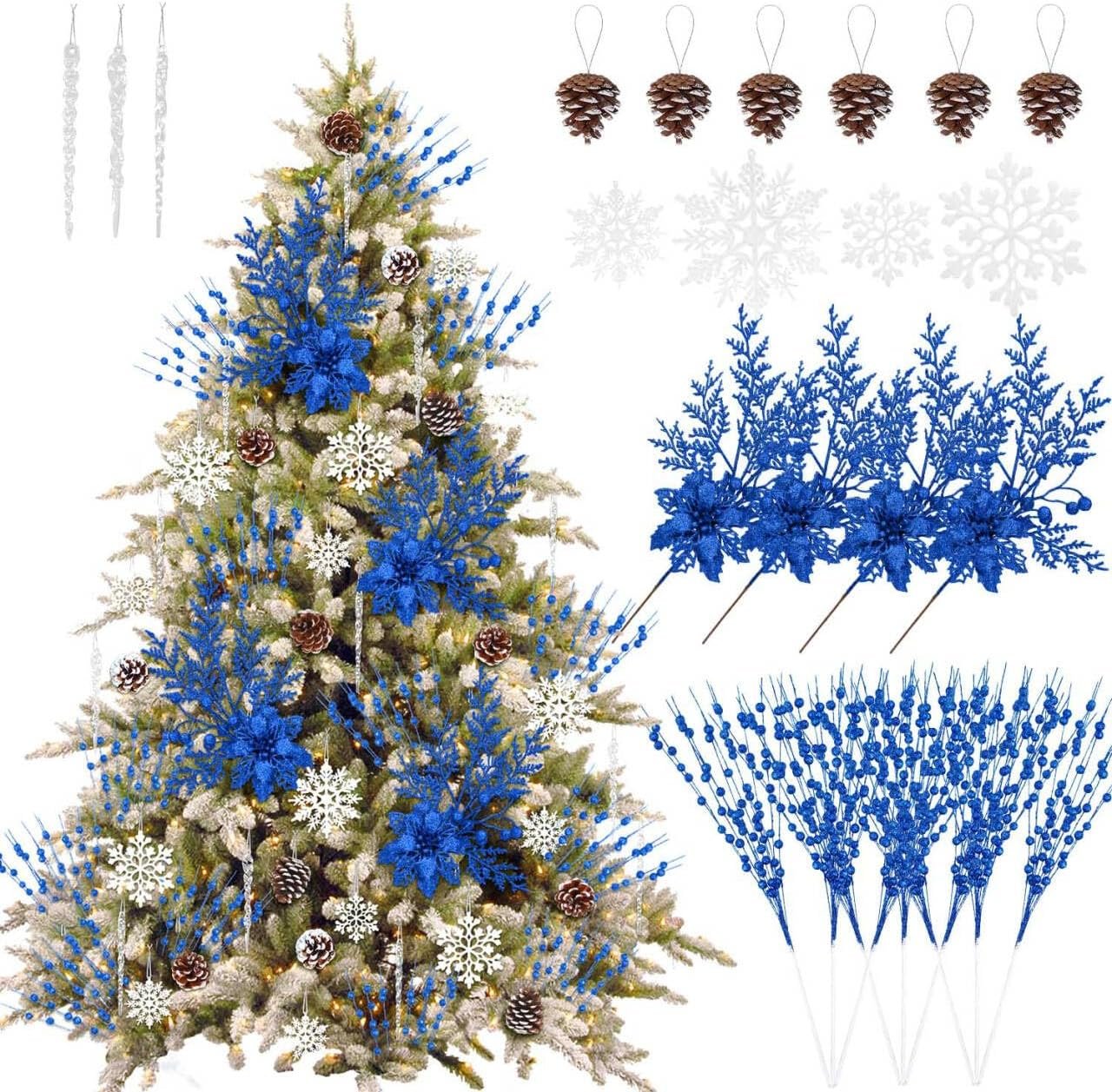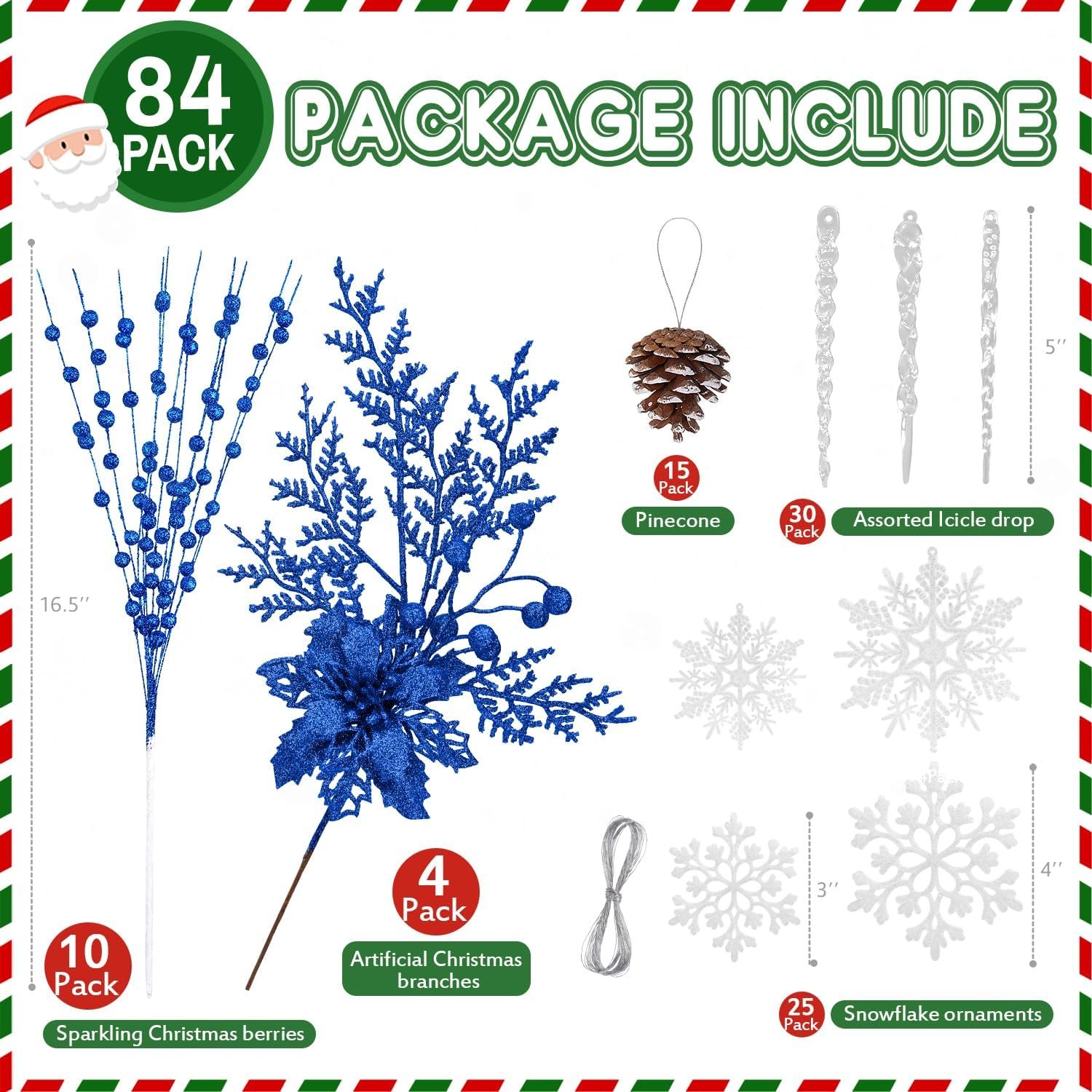 84 Pack Christmas Tree Decorations, Glitter Berry Stems, Acrylic Clear icicles Ornaments, Snowflake Ornaments, Artificial Christmas Flowers, Natural Pine Cones, Xmas Tree Decor (Blue)