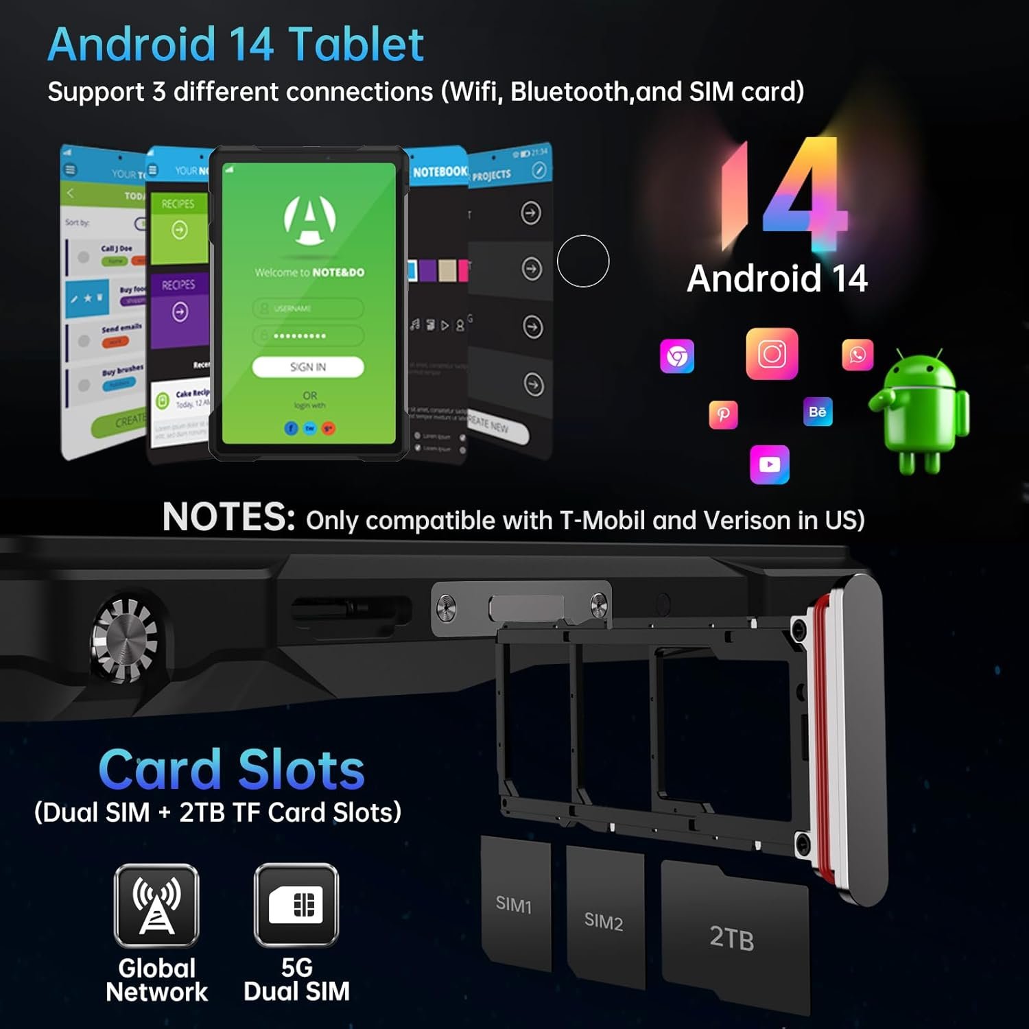 【Supports 3 Types of Connections】IP68 Waterproof Tank Pad rugged tablet is designed with latest Android 14 system. Tank Pad tablet with sim card slot is not only a tablet, also a big size rugged smartphone. You can use SIM card(supports T-Mobile and Verizon in U.S.), WiFi or Bluetooth connecting. Attention: there is designed with 2 speaker(97dB) , you can clearly hear calls or watch videos even in noisy environments