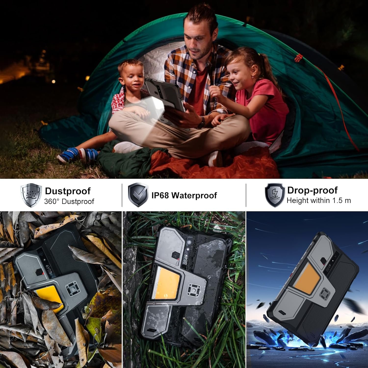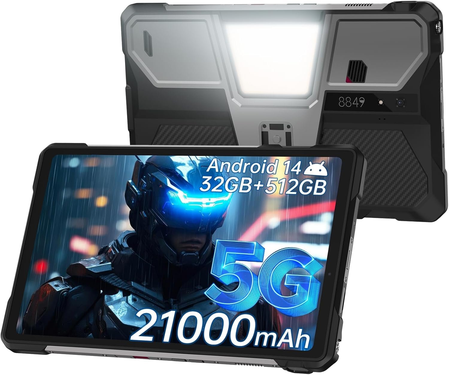 【IP68 Waterproof 5G Tablet with 800LM Camping Light】8849 Tank Pad shockproof android tablet complies with IP68 waterproof, dust-proof, and shockproof performance(Attention: If the screen falls onto an uneven surface, it may shatter). Meanwhile, 8849 Tank Pad tablets 512GB is designed with a 800 lumens camping light, which are versatile for site construction, emergency repair, vehicles maintenance lighting, outdoor adventures, or family emergency such as natural disasters