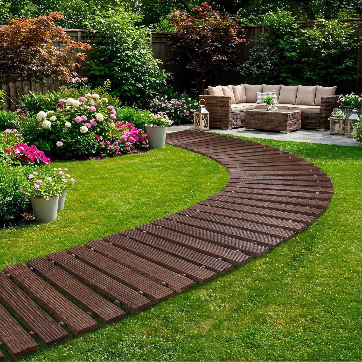 【Convenient Roll-Up Design】 Outdoor walkway features a space-saving roll-up design, making it easy to combine multiple boardwalks or create custom curved paths. No assembly is needed—simply rearrange or remove sections without the hassle of traditional decks. Lightweight and portable, it’s perfect for both permanent and temporary use.