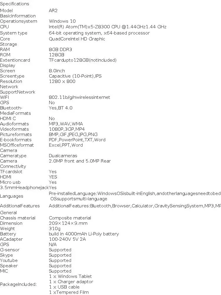 19 reviews for 8GB RAM 128GB ROM Windows 10 Tablet 8 INCH 64bit Intel x5-Z8300 Quad Core Ultra-thin Bluetooth WiFi With Tempered Film Free Gift
