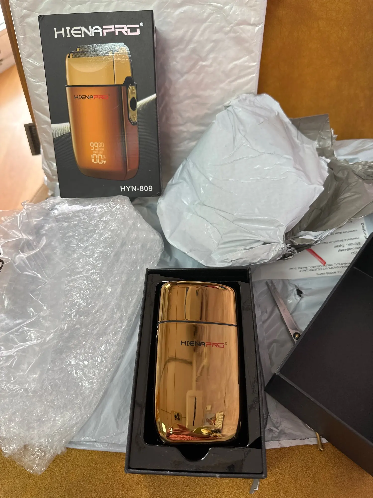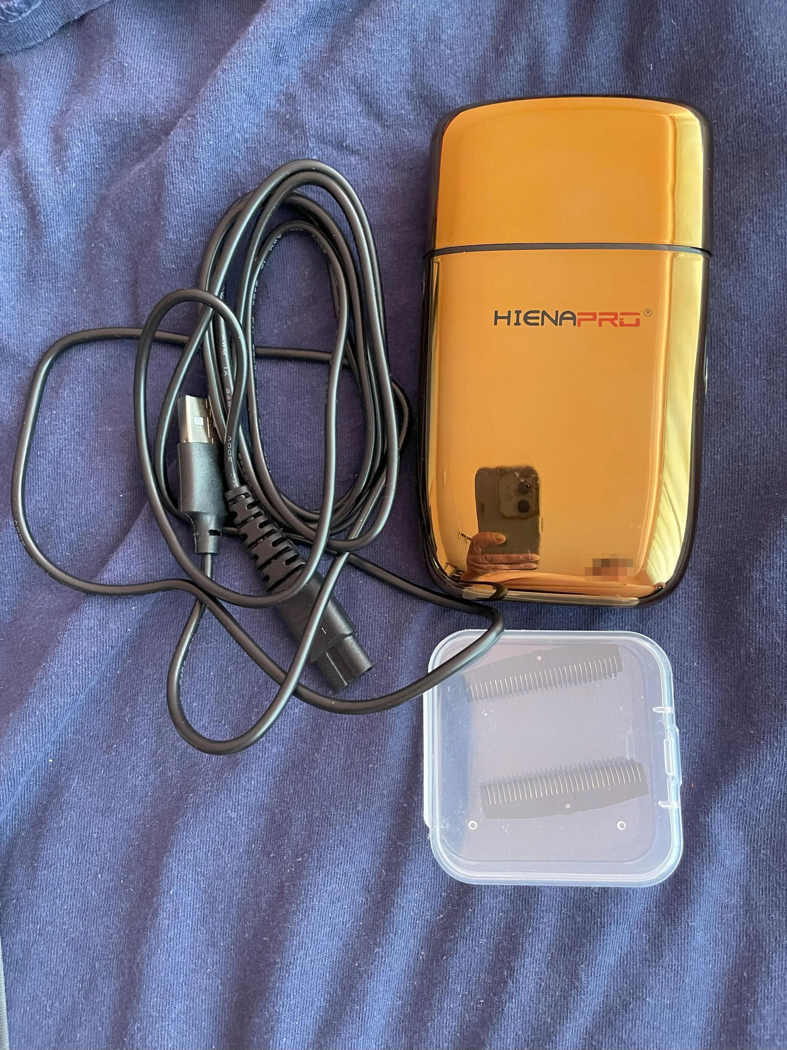 The shaver came in a sturdy box with charging cable and as ordered two additional blades in extra box. The price is good.