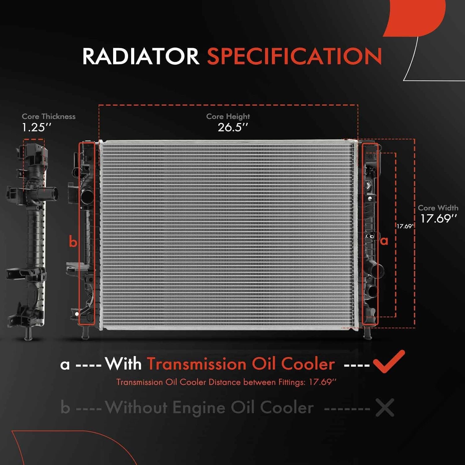 [Specifications]: ① Transmission Oil Cooler Included: No; ② Engine Oil Cooler Included: No; ③ Core Length: 26-1/2 inch; ④ Core Thickness: 1-1/4 inch; ⑤ Core Width: 17-11/16 inch; ⑥ Inlet Diameter: 1-5/16 inch; ⑦ Outlet Diameter: 1-5/16 inch