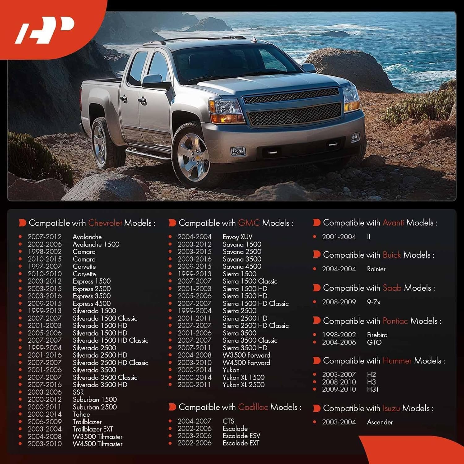 [Perfect Fitment]: Compatible with Avanti II 01-04; Compatible with Buick Rainier 04; Compatible with Cadillac CTS 04-07, Escalade/Escalade EXT 02-06, Escalade ESV 03-06; Compatible with Chevrolet Avalanche 07-12, Avalanche 1500 02-06, Camaro 98-02/10-15, Corvette 97-07/10-10, Express 1500 03-12, Express 2500 03-15, Express 3500 03-16, Express 4500 09-15, Silverado 1500 99-13, Silverado 1500 Classic/Silverado 1500 HD Classic/Silverado 2500 HD Classic/Silverado 3500 Classic 07-07