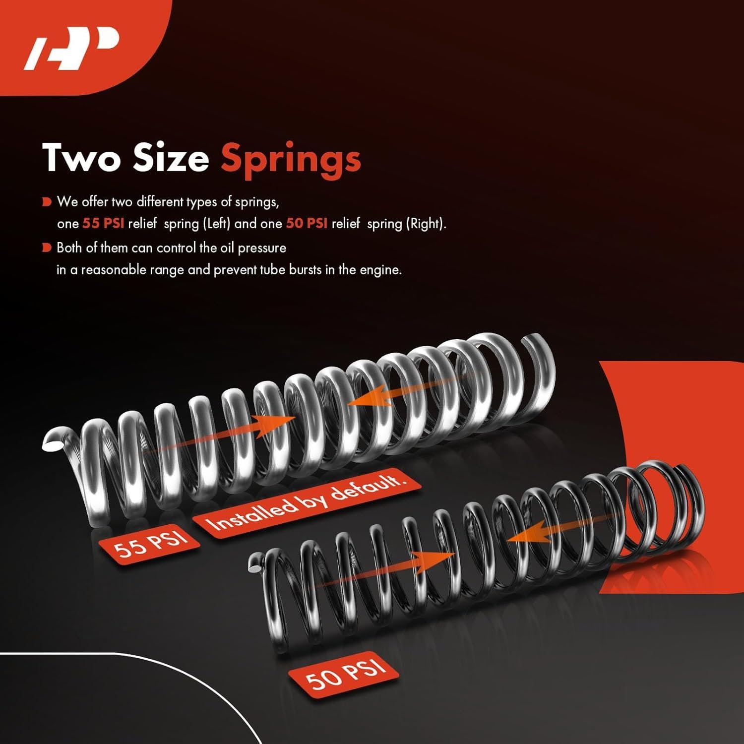 [Two Size Springs]: We offer two different types of springs, one 55 PSI relief spring (default installation) and one 50 PSI relief spring (replaceable installation). Both of them can control the oil pressure in a reasonable range and prevent tube bursts in the engine. The oil pump (also called “Bomba de aceite”) can replace for part mumber: 10296