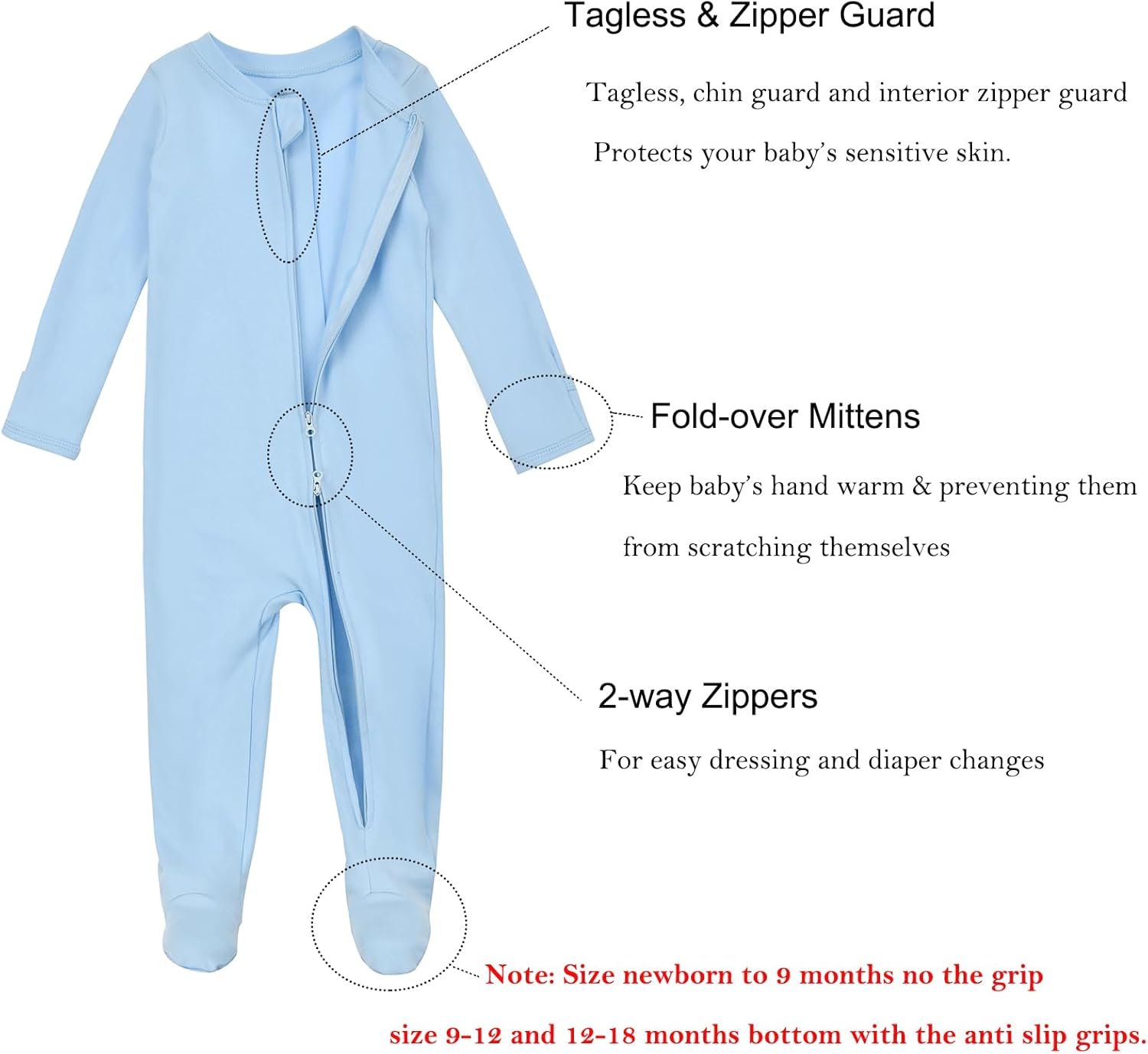 Size 9 to18 months baby footie pjs features grip on the feet for extra stability. Great for little baby on the move(0-9 months size without non-slip grips)