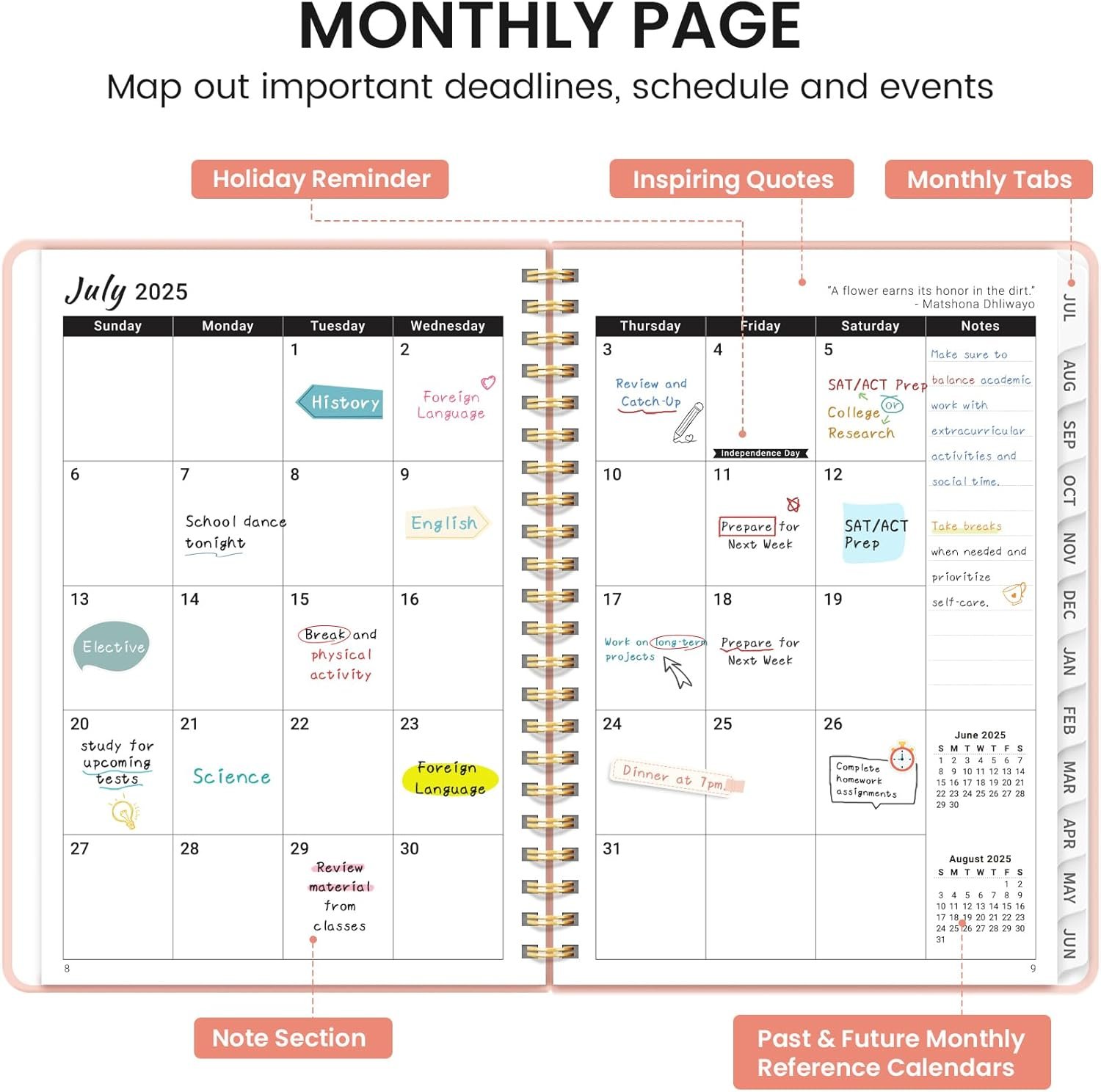 Thoughtful Design: The teacher planner 2025-2026 comes with an elastic band to keep it securely closed, monthly tabs for quick navigation, and a clear double-sided pocket for extra storage. Each monthly calendar page includes a motivational quote to inspire and keep you focused. These details ensure a smooth planning experience with everything you need.