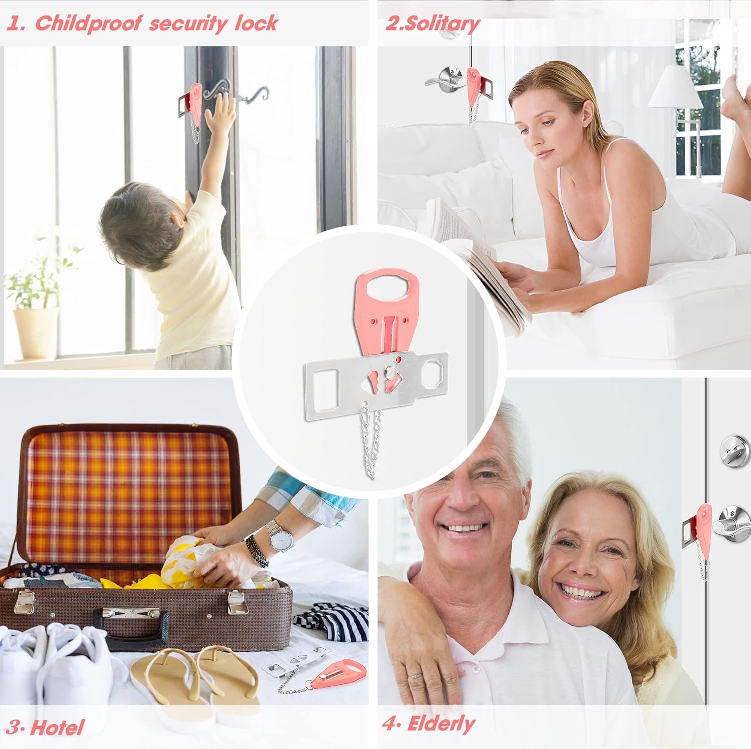 Easy to Use – Easy to install or remove, this hotel lock can be installed in seconds without any tools, locks for doors bring apartment security, even in emergency situations and in the dark. Just insert the metal piece into the slot of the door lock, close the door, and then put the pink handle groove to the stud on the metal sheet, then no one can open the door from outside.