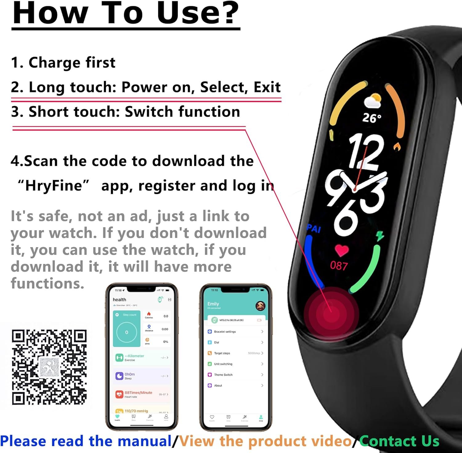 If you don’t know how to use it, please contact us. We will have professional customer service to warmly answer your questions! Or read the manual! You need to charge it first. The QR code is the “HryFine” app for downloading the corresponding watch, not an advertisement, it is safe.
