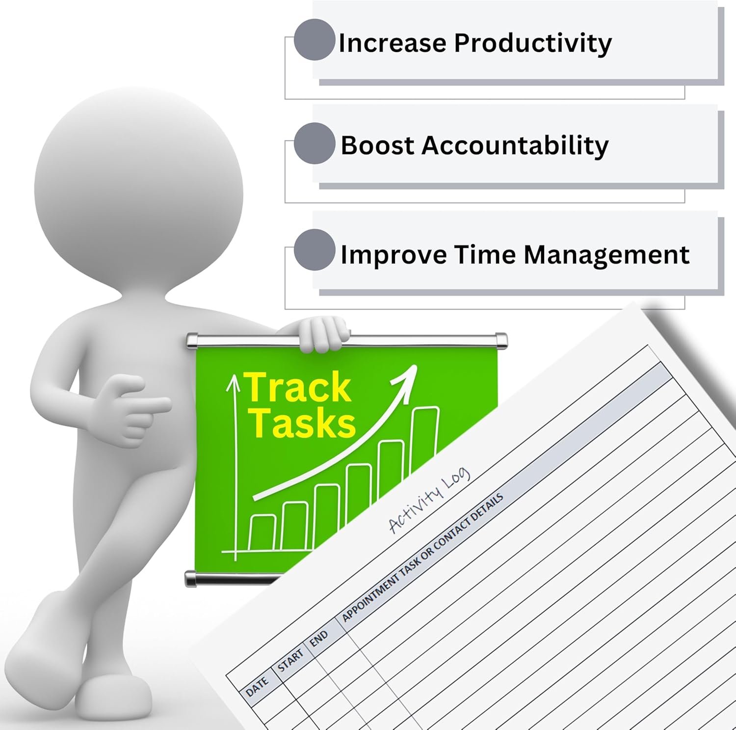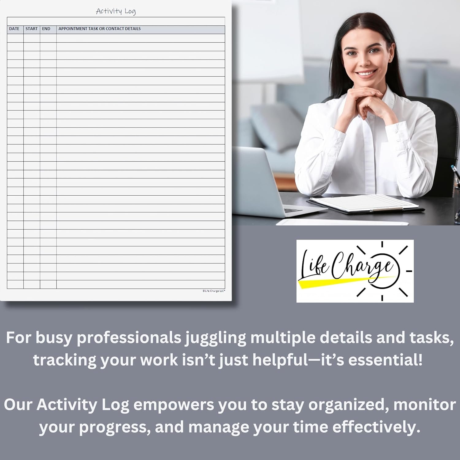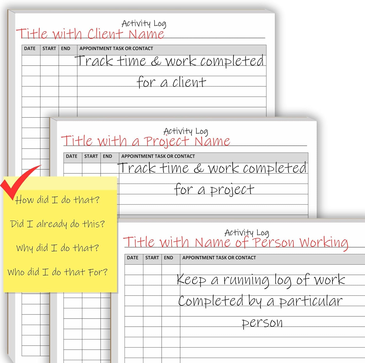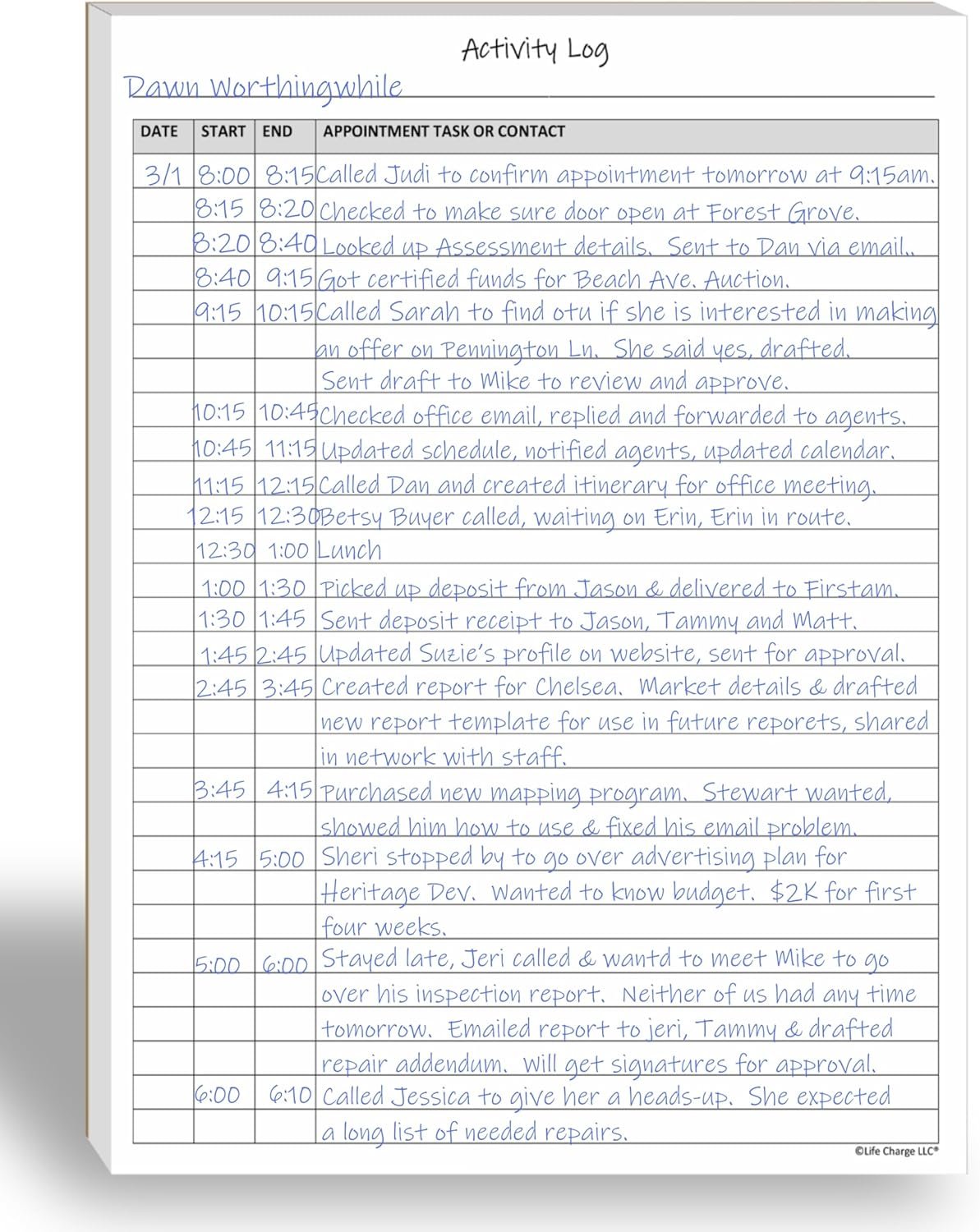 Activity Log Notepad. These activity log books are helpful for work, home, personal and professional use. The format of this activity log allows for tracking date, starting time, and ending time. Use a single line or multiple lines to describe the appointment, task, or contact. It has a blank line at the top of each sheet to title each activity log sheet. Use one or many sheets for each project. FINALLY, a versatile activity log that can be used for many purposes and timeframes.