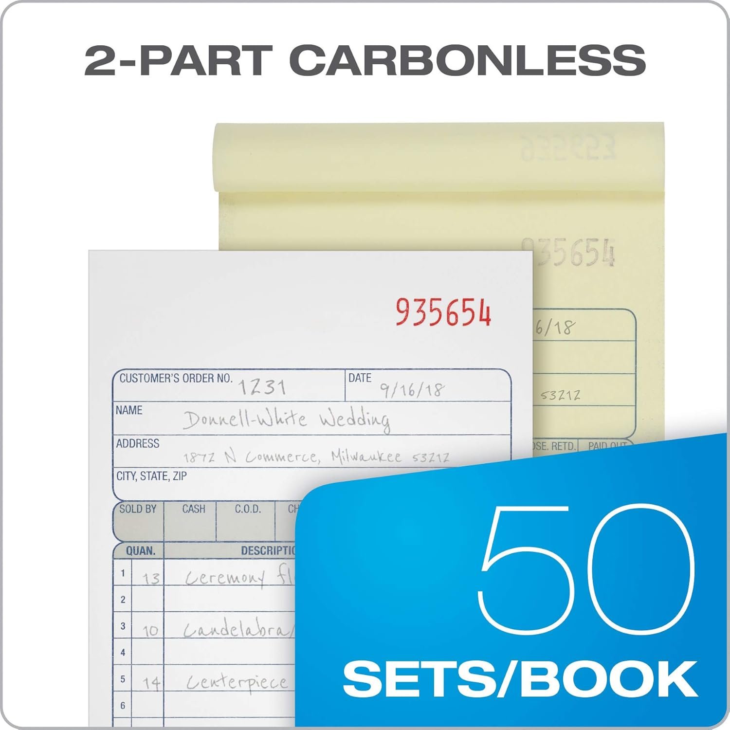 50 TWO-PART CARBONLESS FORMS: Customers get the perforated white top copy; retain the canary and pink copies for your records