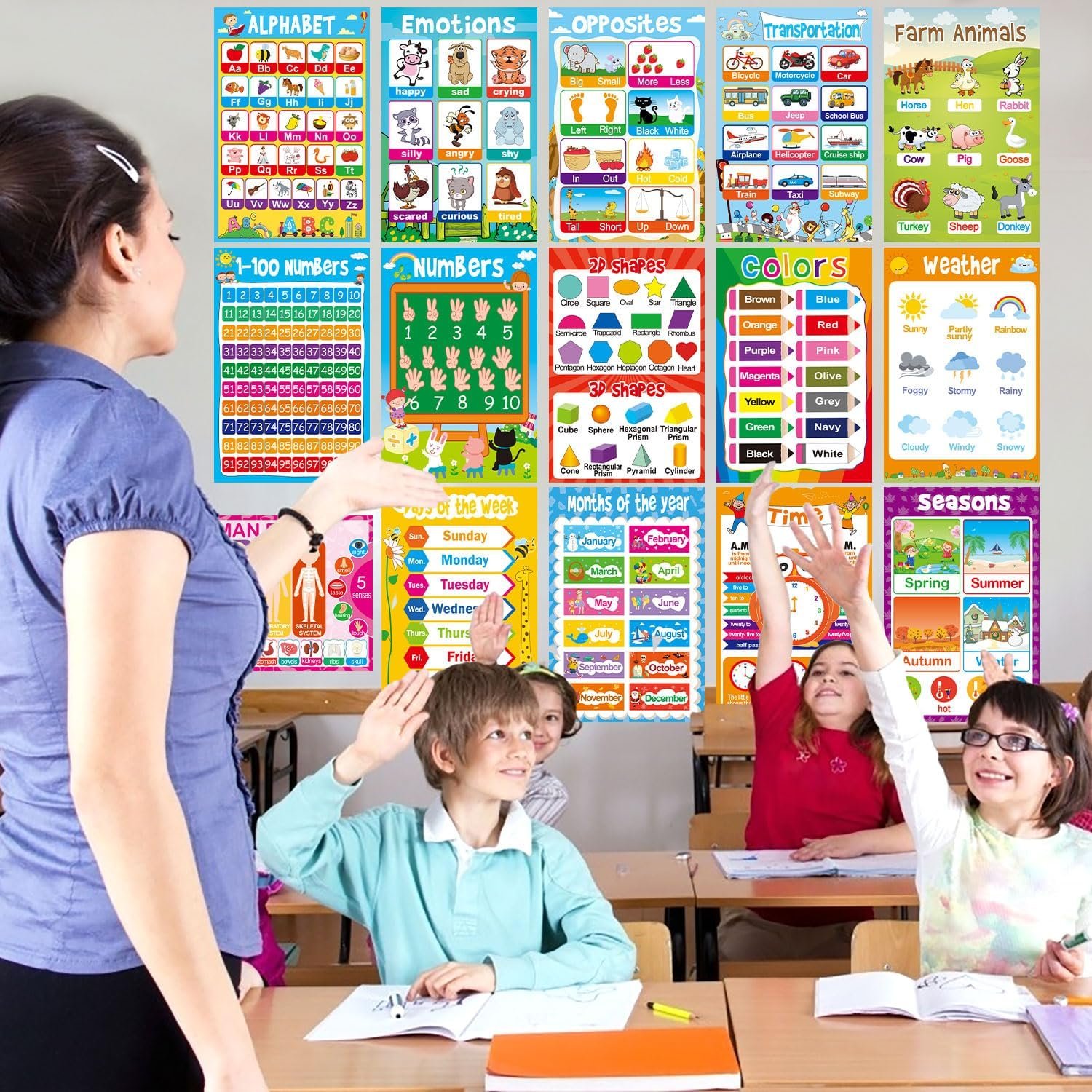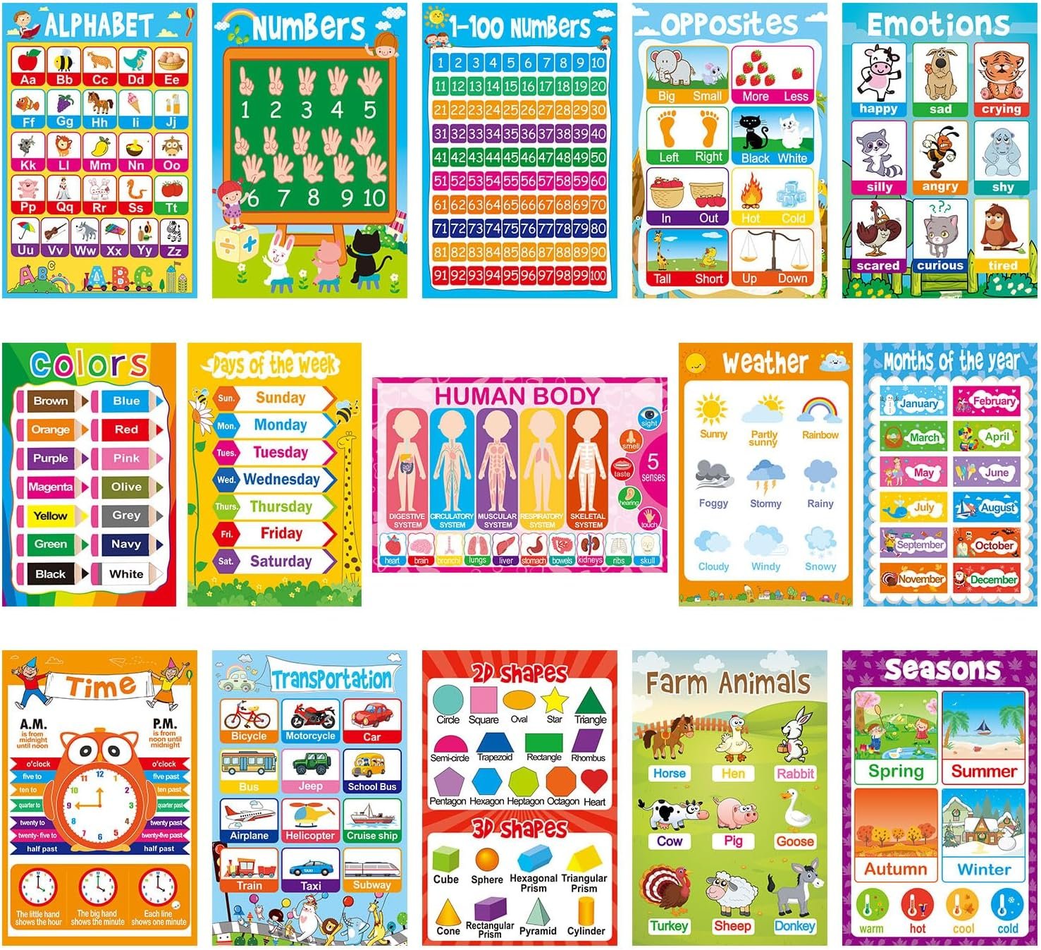 ADELULU 15 Educational Posters for Toddlers Kids Learning Alphabet Numbers Shapes Colors and More (15 Pack)