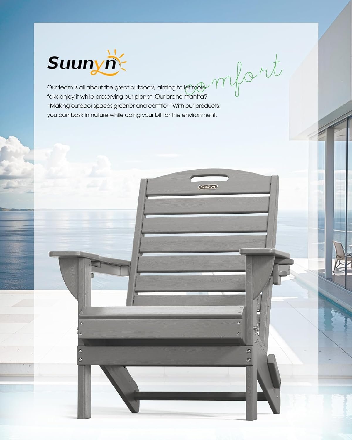 Weather-Resistant: Made of high-quality HDPE material with wooden texture, SUUNYN sturdy adirondack chair offers excellent weather resistance, resisting fading, splitting, cracking, chipping, peeling, and rotting in harsh conditions. Plus, its easy-to-clean surface and low maintenance
