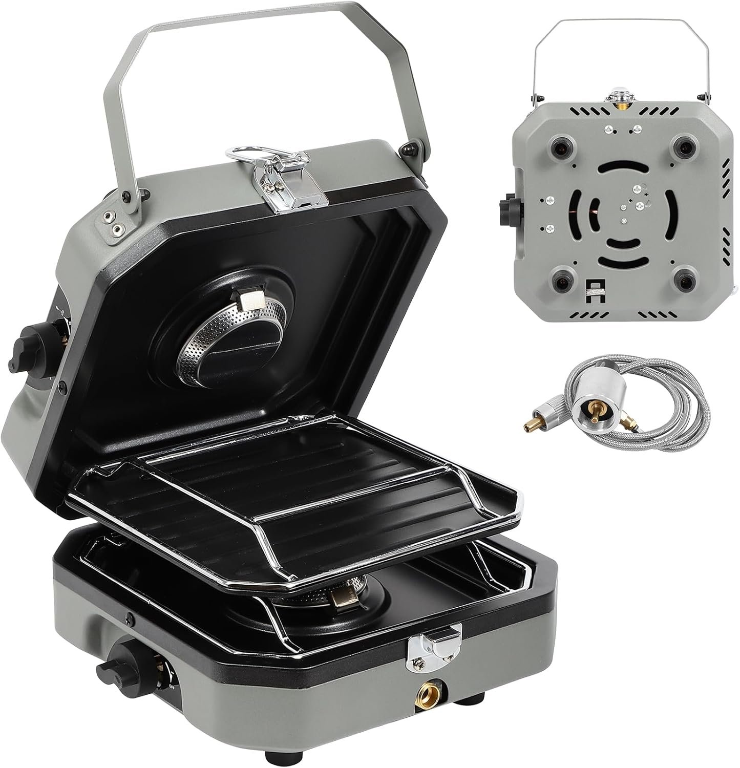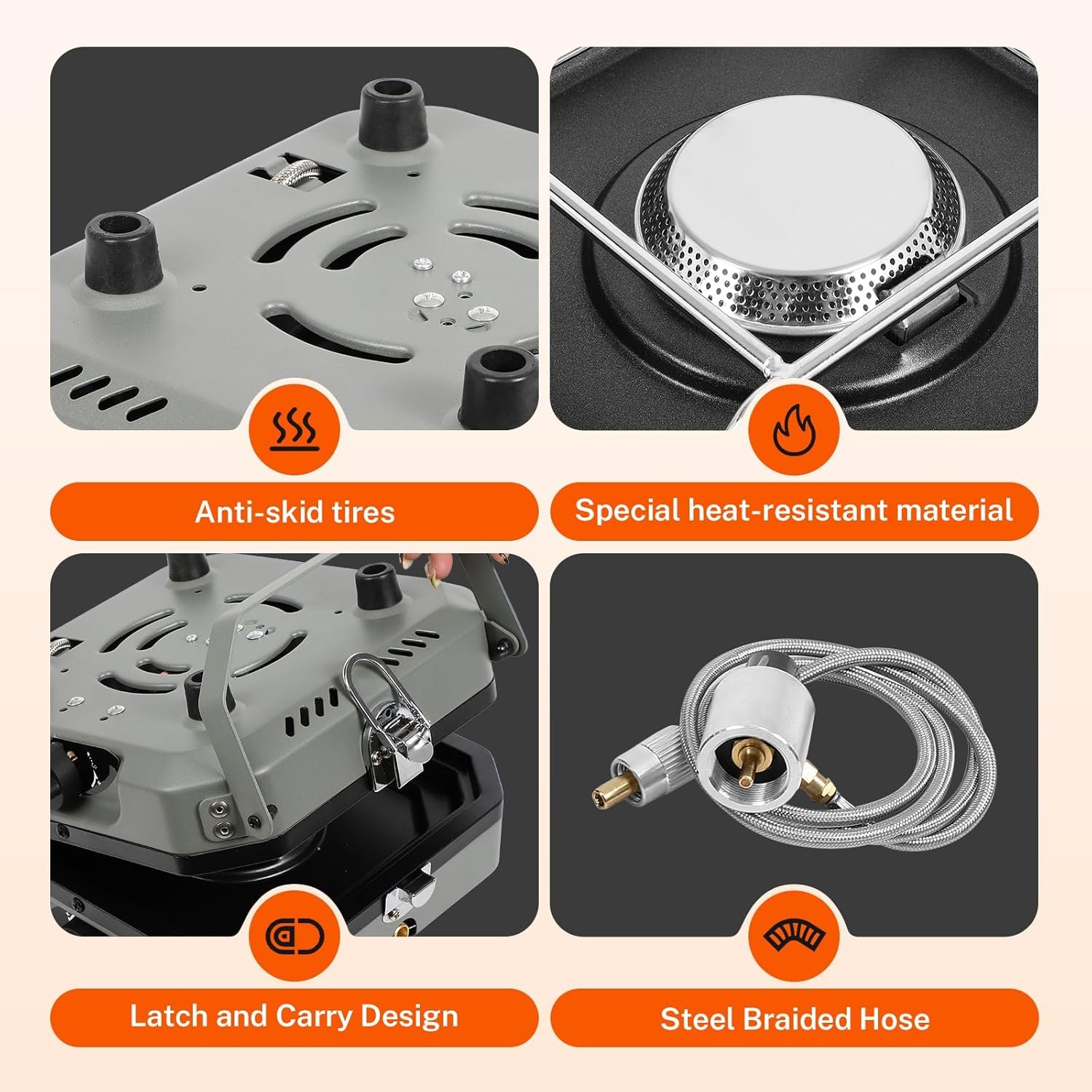 HIGH HEAT DUAL BURNERS: Propane camp stove features dual stainless steel sealed burners with a total of 16,000 BUT of cooking power for even heating; 2 burners with independent on/off controls can be used at the same time for efficient cooking and a variety of cooking options, from slow simmering to high-heat searing