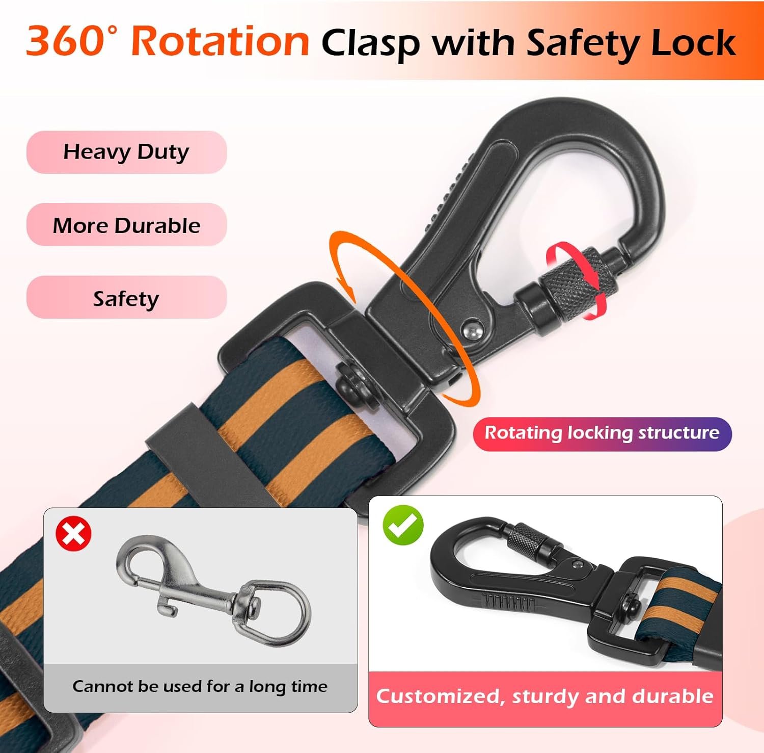 Metal Accessories: There is a heavy-duty rotary buckle and a D-ring on the belt. The heavy-duty rotary buckle can be rotated 360° to prevent the belt from twisting and tangling; The D-ring allows you to clip the poop bag and any accessories you want to carry around with you.