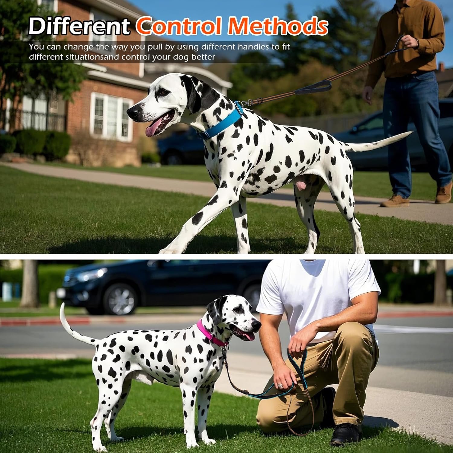 Dual Handle Control: Dual handle design provides multi-function control. Standard handles are available for walking, and in crowded areas, quickly grab the built-in traffic handles to guide your dog through with ease.
