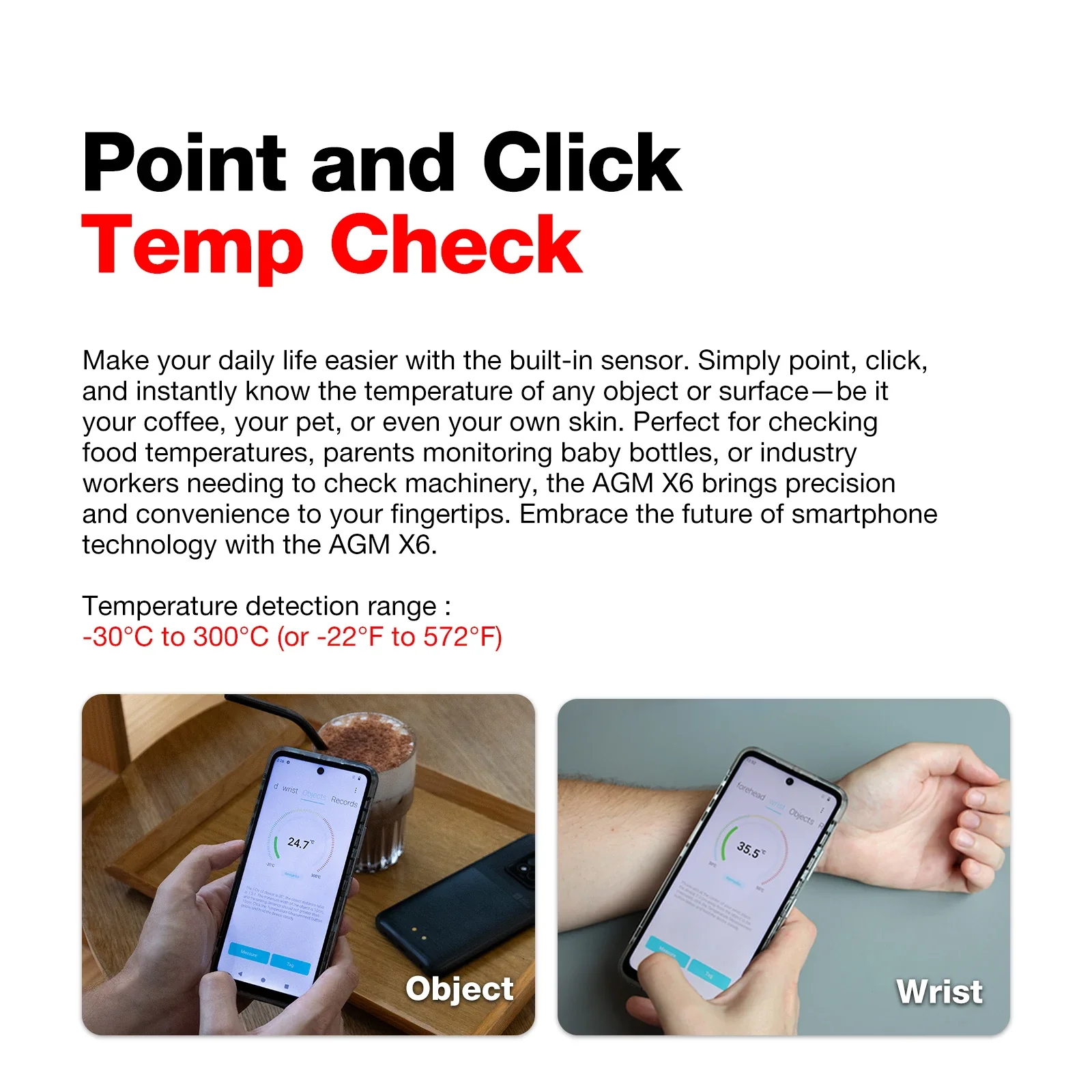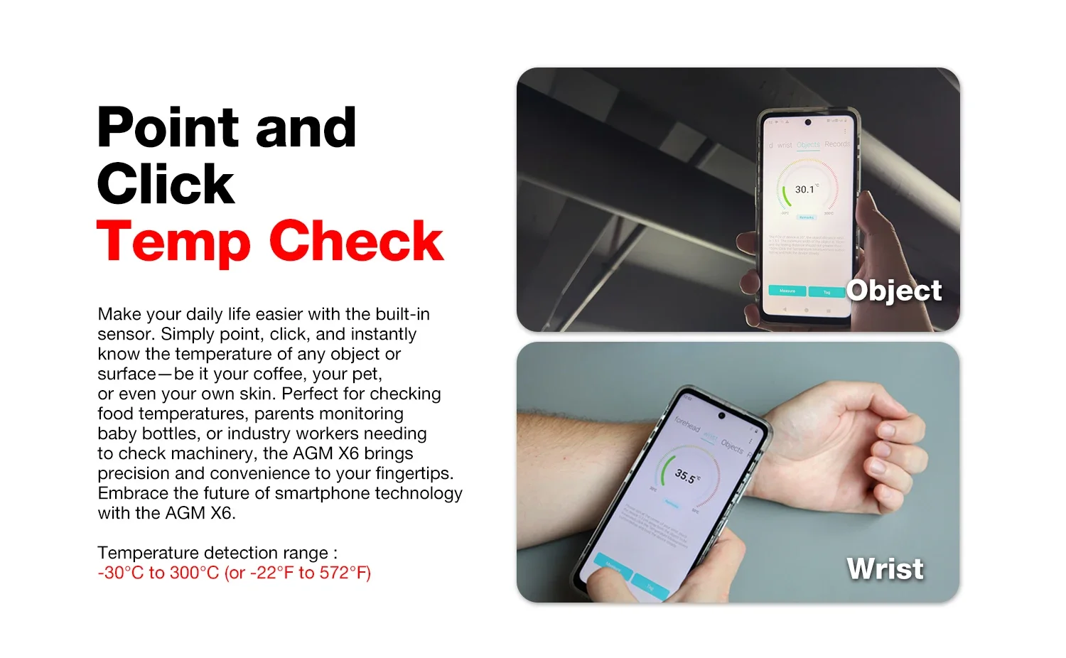 Temperature measurement function, body temperature and object temperature, object temperature range -30℃~ 300℃