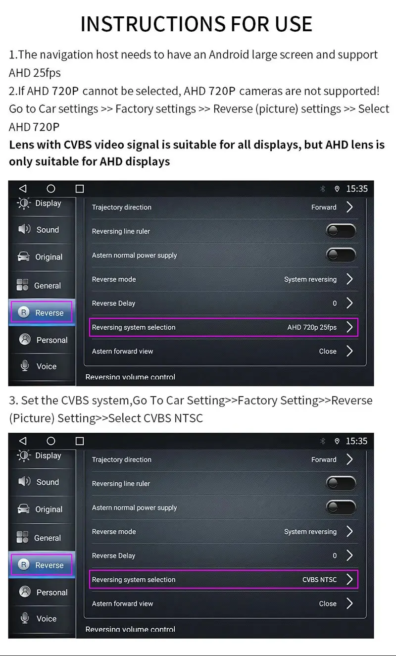 (1)Please check if your Android monitor supports AHD720P before purchasing