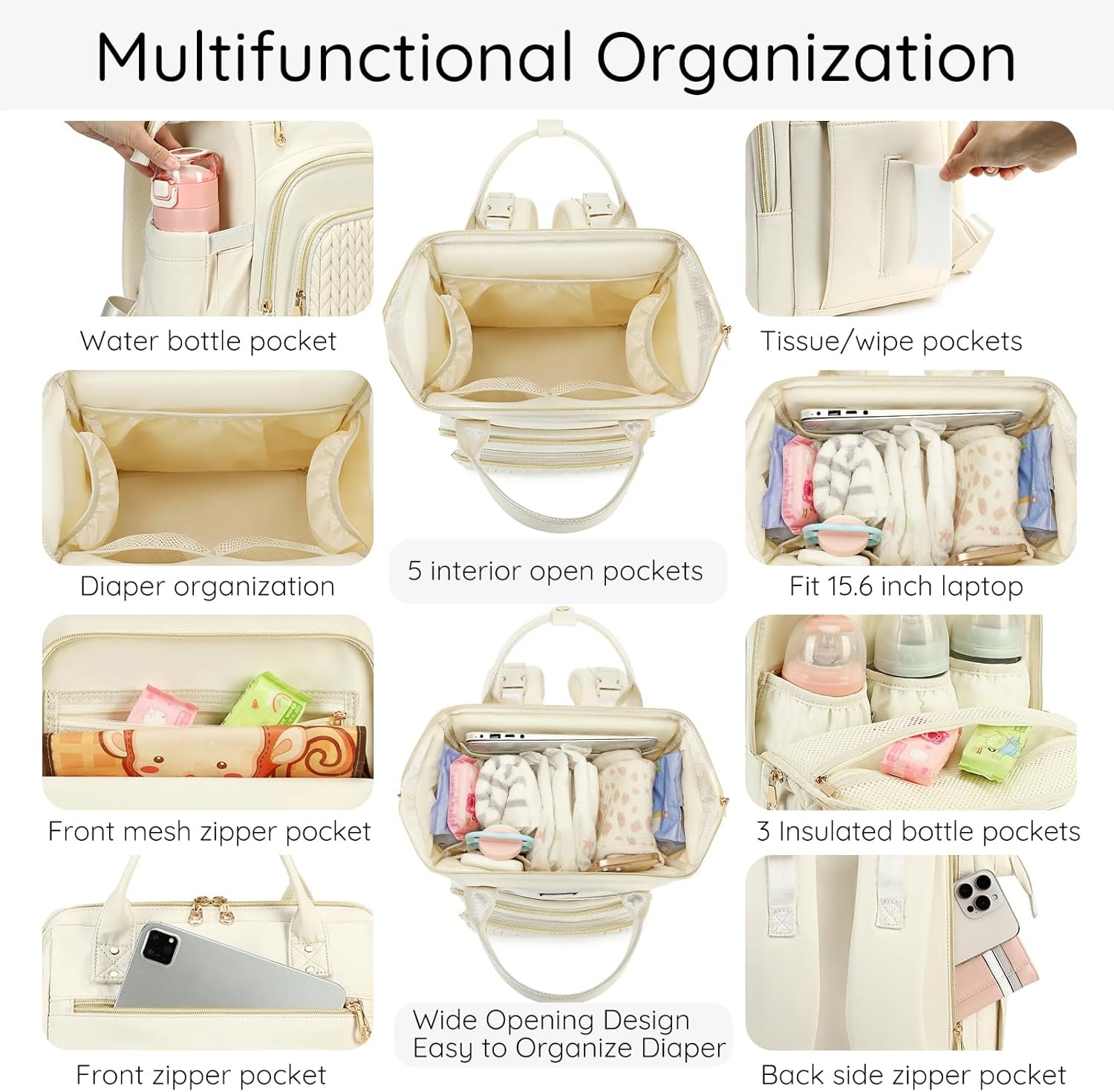 Multifunctional Diaper Bag – 14 Storage Pockets & 3 Compartments. 1. Extra wide opening main storage pocket, two inner pockets, two mesh pockets, one 15.6-inch laptop pocket. 2. Front zipper pocket. 3. Insulated zipper pocket with three bottle pockets inside for most bottle sizes, one mesh zipper pocket. 4. Easy-to-organize front zipper pocket with mesh zipper pocket inside. 5. Back side zipper pocket for changing pads or other things. 6. 2 elastic side pockets for water bottles/tissues/wipes