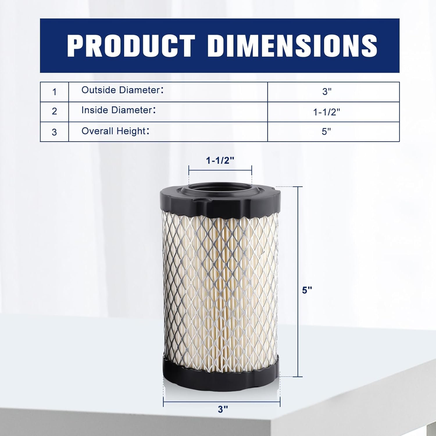 [Dimensions For Husqvarna YTH24V48 Air Filter]: Outside Diameter:3″, Inside Diameter:1-1/2″, Overall Height:5″(Measurements do not include pre filter).