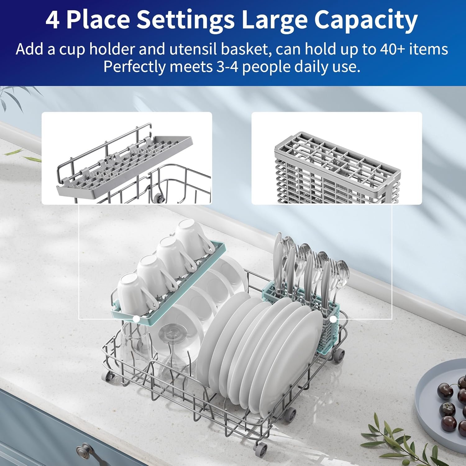 Small Size but Large Capacity – The ultra-compact design allows the mini dishwasher to wash 40+ items (up to 12-inch plates, but needs to be placed at a slight angle), easilymeeting the daily needs for a family of 3-4. Plus, this portable dishwasher measures just 16.75W x 16.86D x 18.05H inches, occupying a small area, perfect for small houses, apartments and RVs/campers.