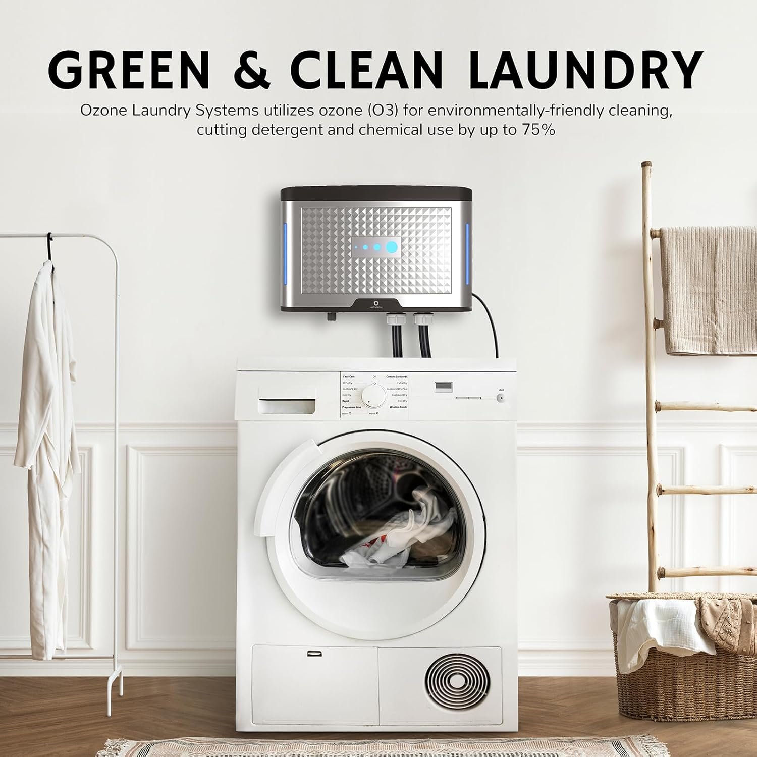 Disinfection, Sterilization, and Deodorization: Reduce your reliance on laundry detergent and chemicals with ozone’s disinfecting, sterilizing, and deodorizing capabilities. Eliminate odors caused by mold and mildew while enjoying softer, odor-free clothes that maintain their quality and appearance over time.