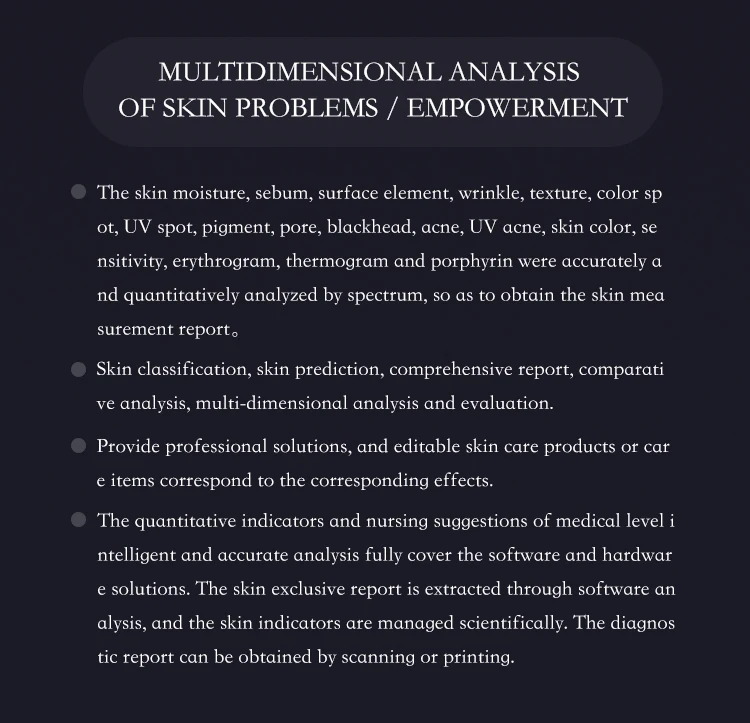 “as a high-end beauty professional, i’m always on the lookout for cutting-edge technology, and this skin analysis device has exceeded all my expectations! It’s incredibly precise, offering detailed reports that allow me to tailor treatments perfectly to each client’s needs. My clients love the instant results, and it has truly elevated the level of service we provide. A must-have for any top-tier beauty studio!”