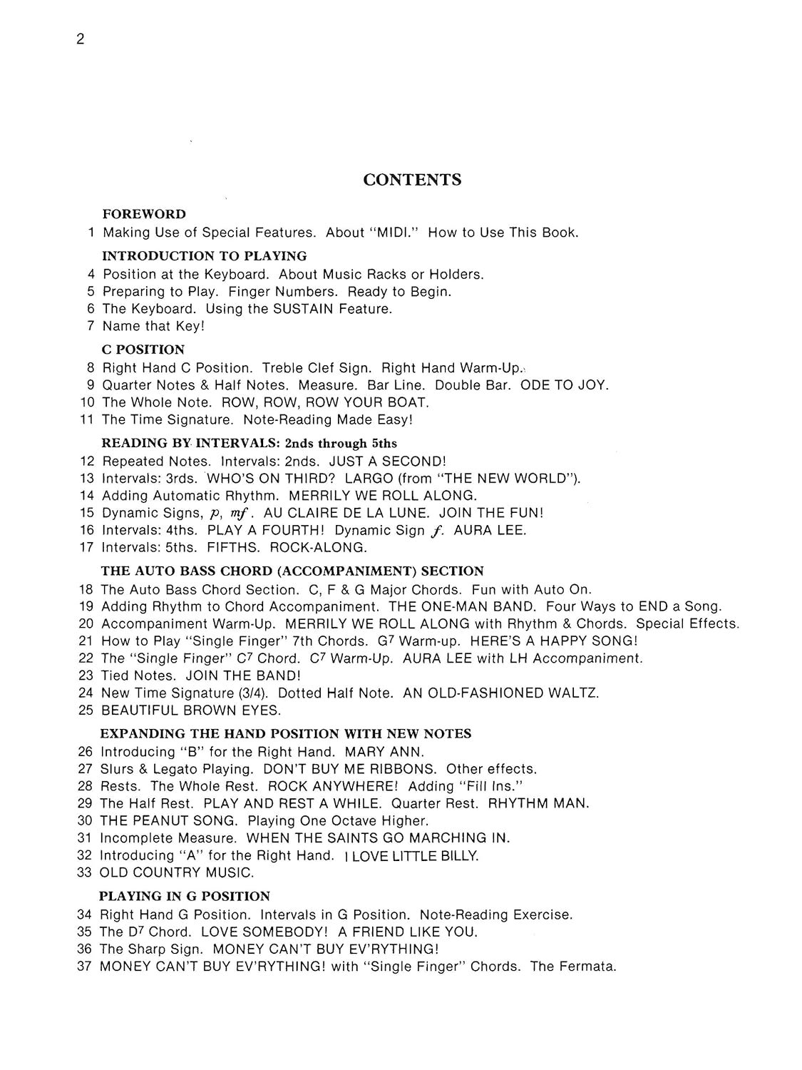 Learn to play the electronic keyboard and open up a brand new world of musical knowledge with this exciting method from Alfred. Beginners of all ages can start their journey to a lifetime of musical enjoyment. Beginning with the fundamentals, you will learn about MIDI, position at the keyboard, preparing your instrument for use, and proper hand position. You will then move right along to learning about the different keys on the keyboard and basics of standard musical notation. You will immediately dive into playing notes and transforming them into well-known songs, all while continuing to increase your ever-growing knowledge of reading and understanding standard musical notation and keyboard functions. Throughout the book, you will be introduced to a variety of styles, including pop, rock, country, blues, classics, folk favorites, hymns, spirituals and ragtime and upon completion you will know how to use chord symbols to play from pop sheet music, fake books and lead sheets. This book is for keyboards with automatic rhythms and single-finger” chords.