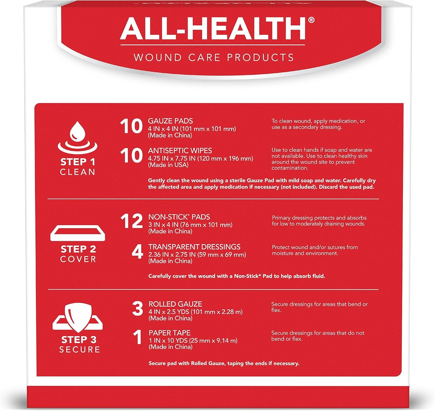 CONTENTS INCLUDED. 10 gauze pads, 10 antiseptic wipes, 12 non-stick pads, 4 transparent dressings, 3 rolled gauze,1 paper tape