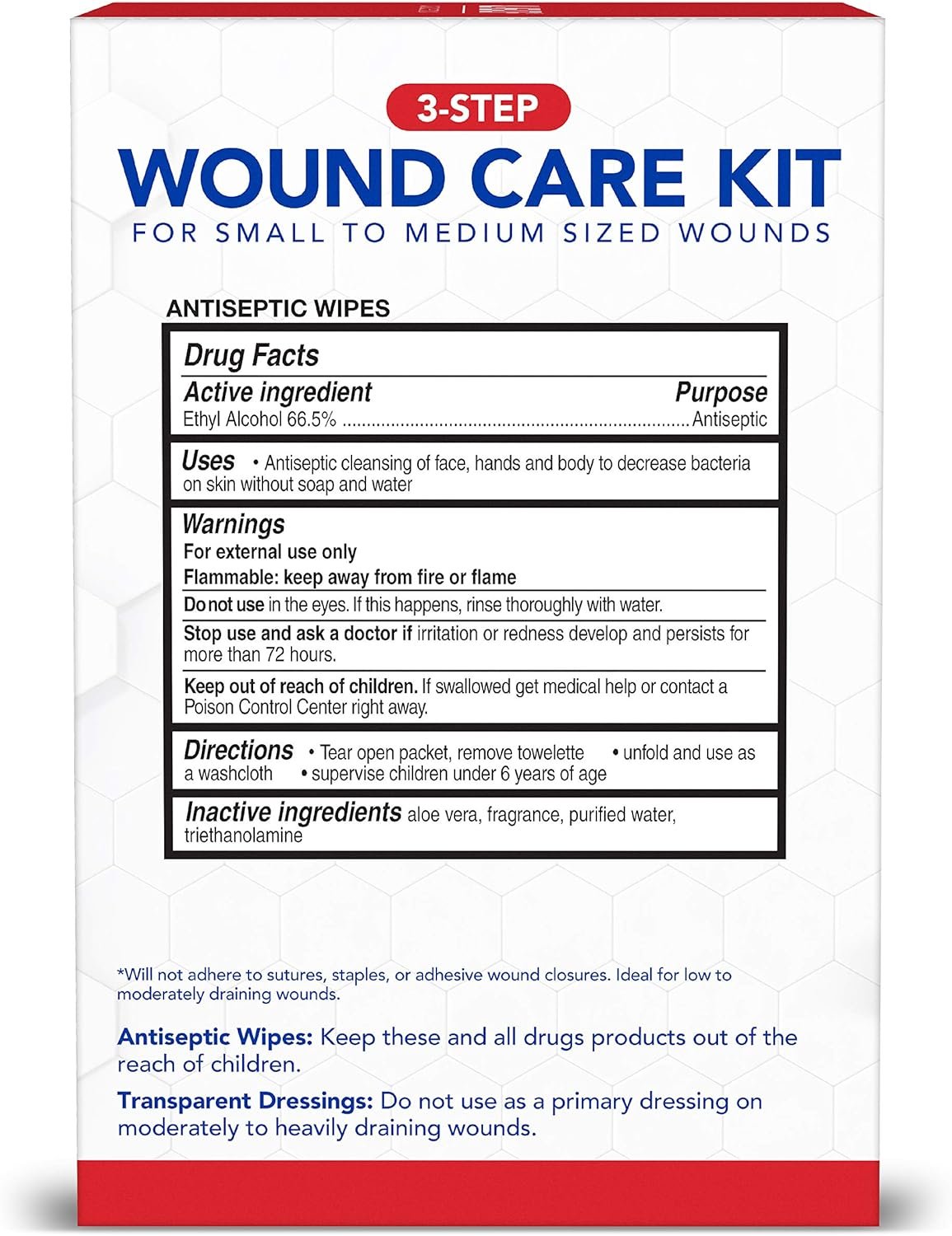 Contents: 10 gauze pads, 10 antiseptic wipes, 12 non-stick pads, 4 transparent dressings, 3 rolled gauze,1 paper tape