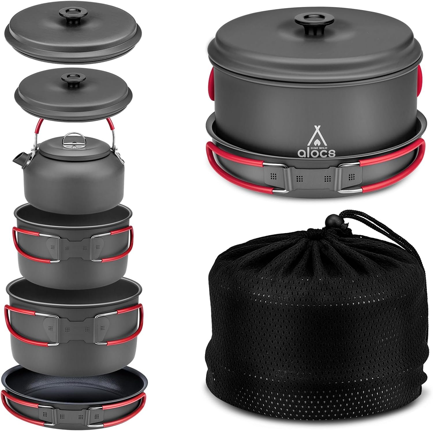 Alocs Camping Cookware Set Camping Gear, Compact Camping Pots and Pans Set, Durable Hard Alumina Camping Cooking Set for Outdoor Backpacking Camping Hiking Picnic, Included Mesh Carry Bag.