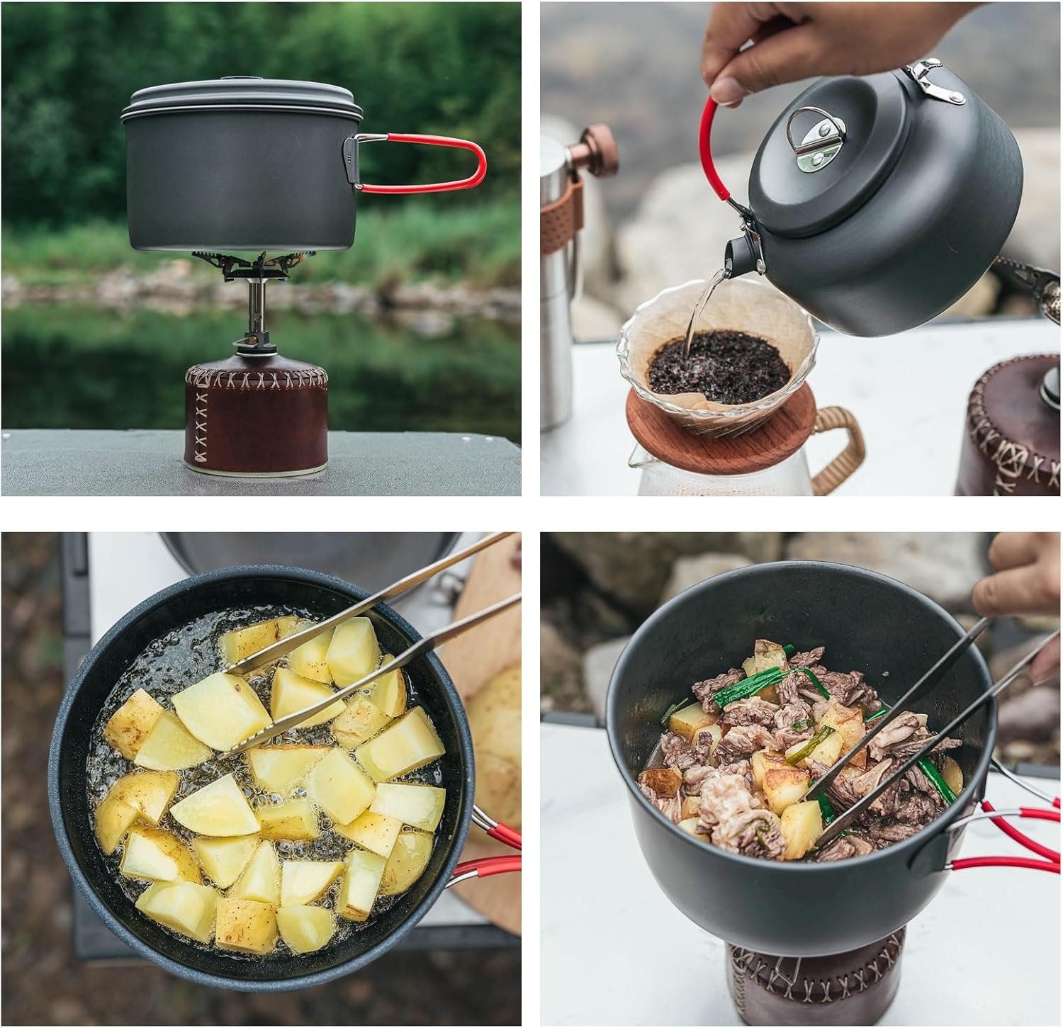 SAFETY & EFFICIENT HEATING: Aluminum boasts better thermal conductivity than iron or titanium, allowing the camping pot heat up quickly and evenly. This not only reduces cooking time but also saves energy and fuel, making your outdoor cooking experience effortless and enjoyable. This camp cooking set is lightweight and durable, making it convenient for your camping trip while also guaranteeing excellent cooking results.