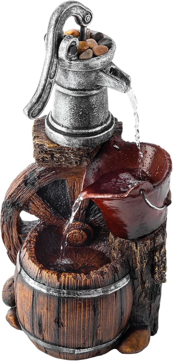 RELAXING WATER FLOW: Water trickles from the pump spout into the bucket and barrel tiers, adding a peaceful ambiance to your outdoor setting.