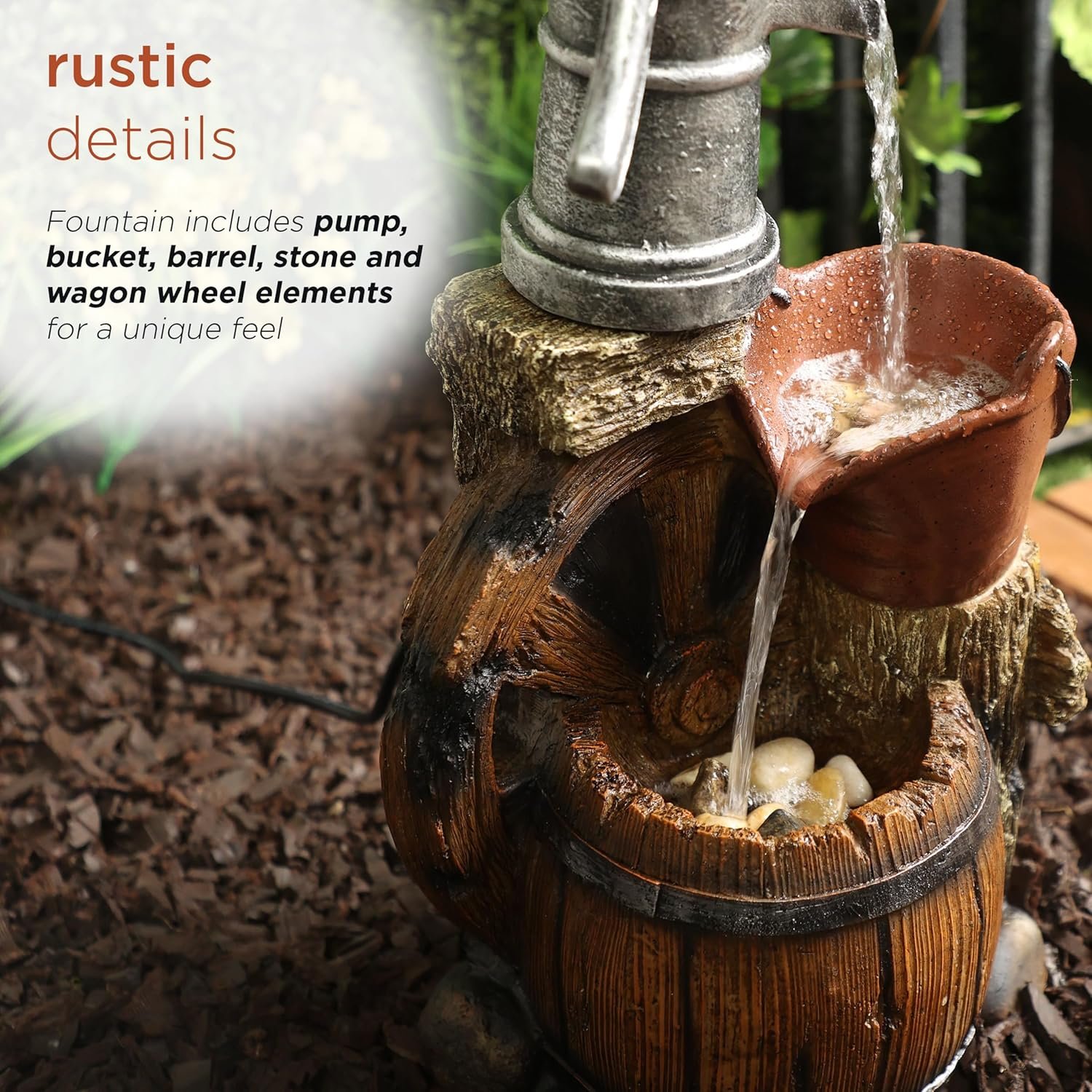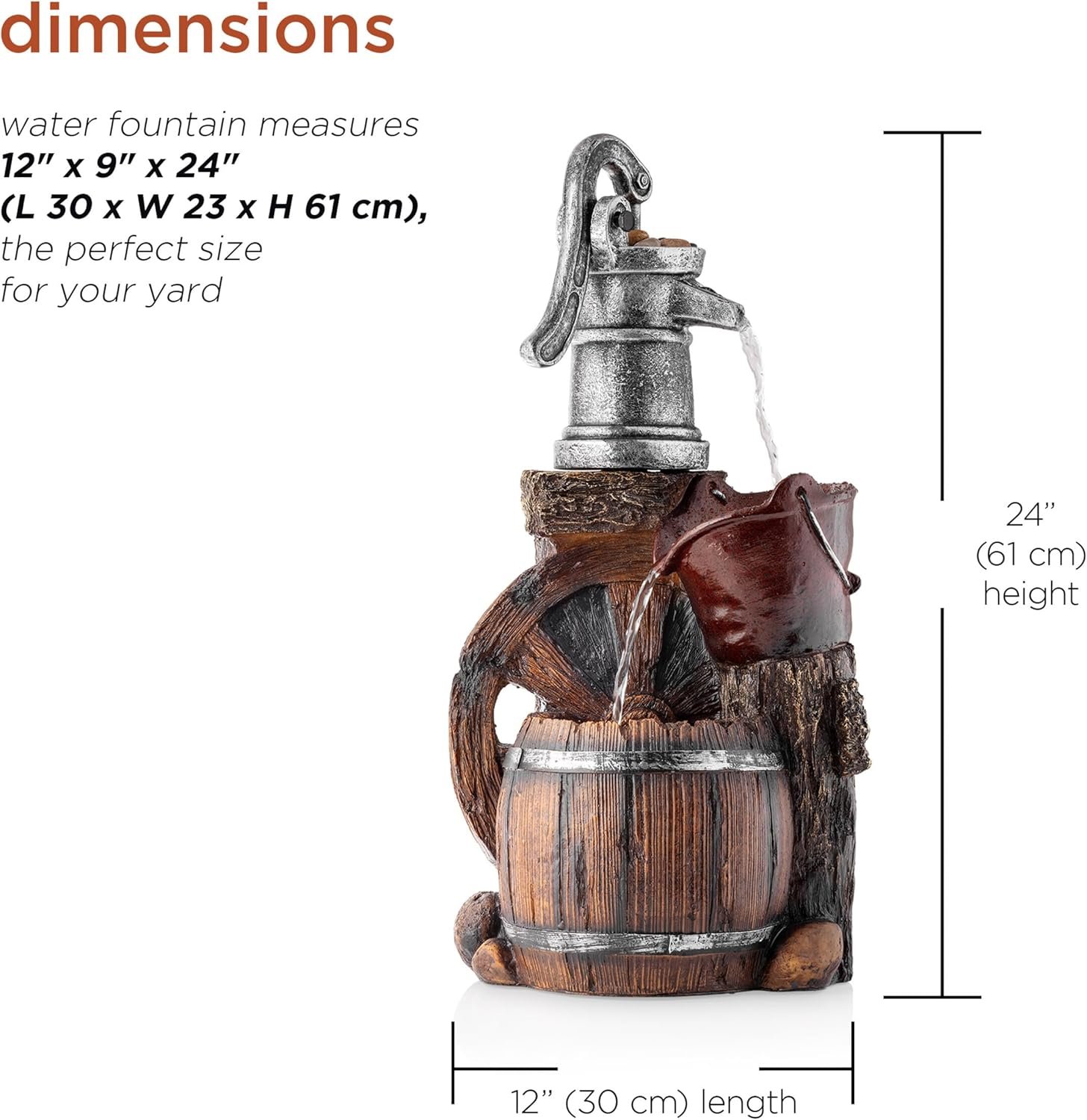 RUSTIC LOOK: Fountain includes pump, bucket, barrel, stone, and wagon wheel elements for an old fashioned western feel.